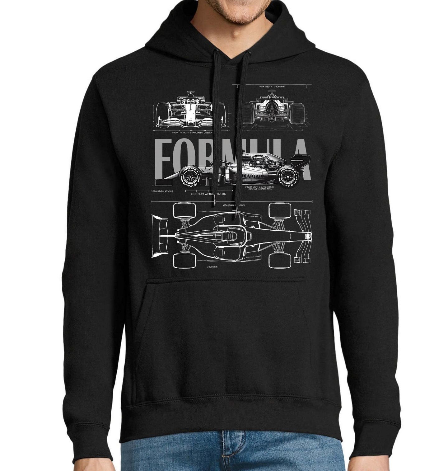 Pánská mikina Technický Blueprint Formule. Detailní a stylový motiv zobrazující závodní formuli jako technický blueprint, který odhaluje konstrukci a design moderního závodního auta. Precizní linie, náčrty a pohledy z různých úhlů dodávají motivu autentický inženýrský vzhled. Dominantní silueta formule v kombinaci s technickými detaily vytváří jedinečný design, který ocení každý fanoušek motorsportu, rychlosti a precizní techniky. T