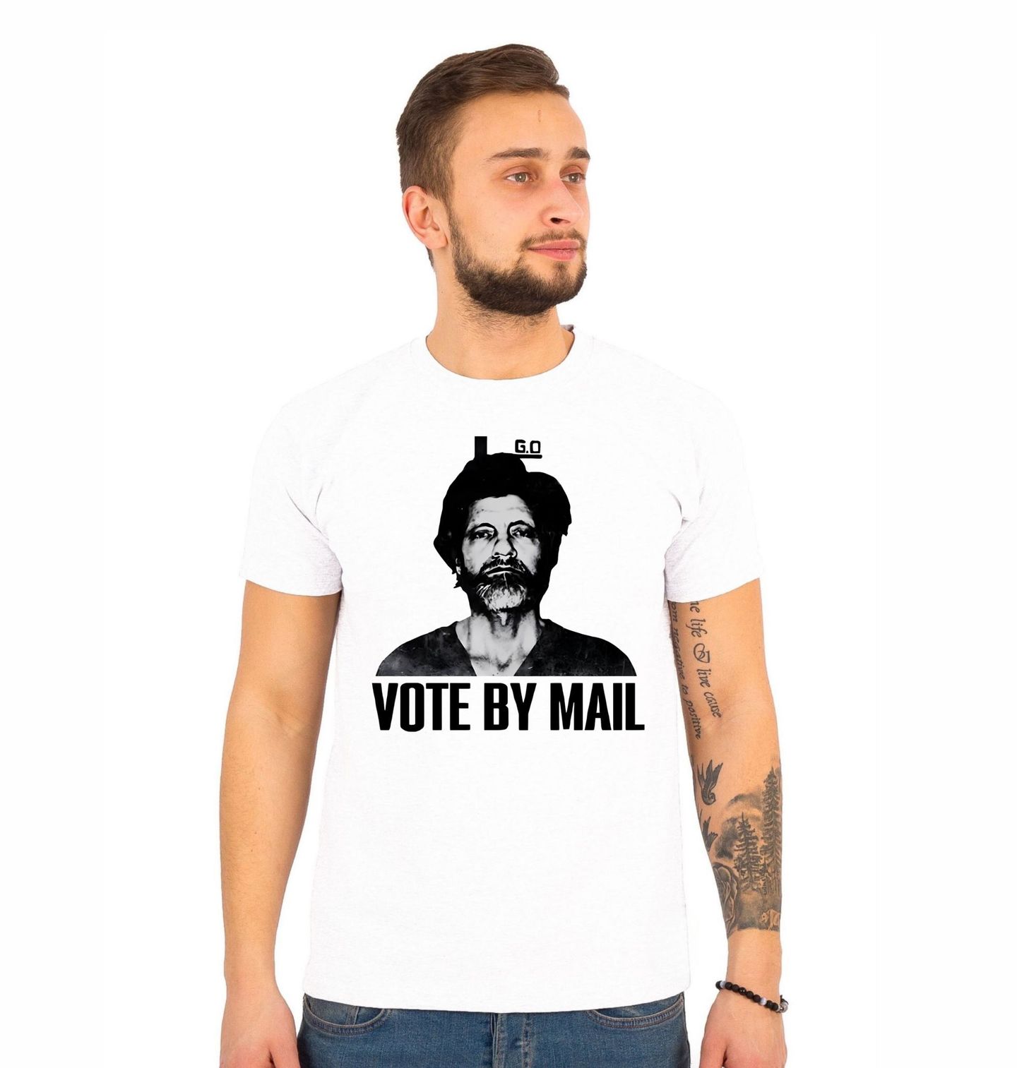 Pánské tričko Ted Kaczynski Vote by Mail. Výrazný černobílý design s textem „VOTE BY MAIL“ (Hlasujte poštou) doplněný stylizovaným portrétem. Motiv nese silné sdělení a moderní grafický styl. Vhodné pro ty, kdo chtějí vyjádřit svůj názor skrze politický design a společenská témata. Theodore John „Ted“ Kaczynski, znám také jako Unabomber, byl americký matematik, sociální kritik, anarchista a neoluddista, který rozesílal po USA podomácku zhotovené bomby.