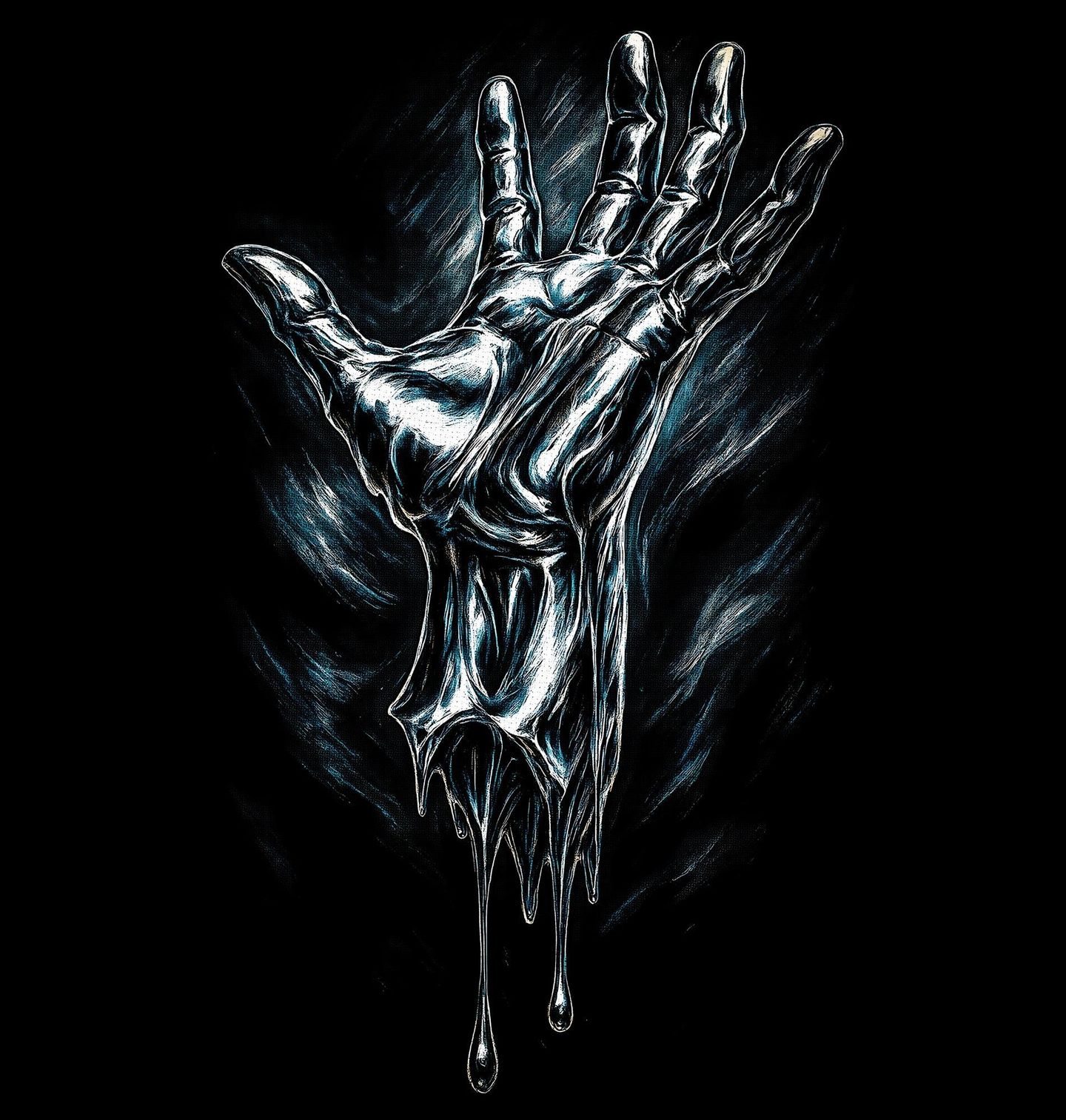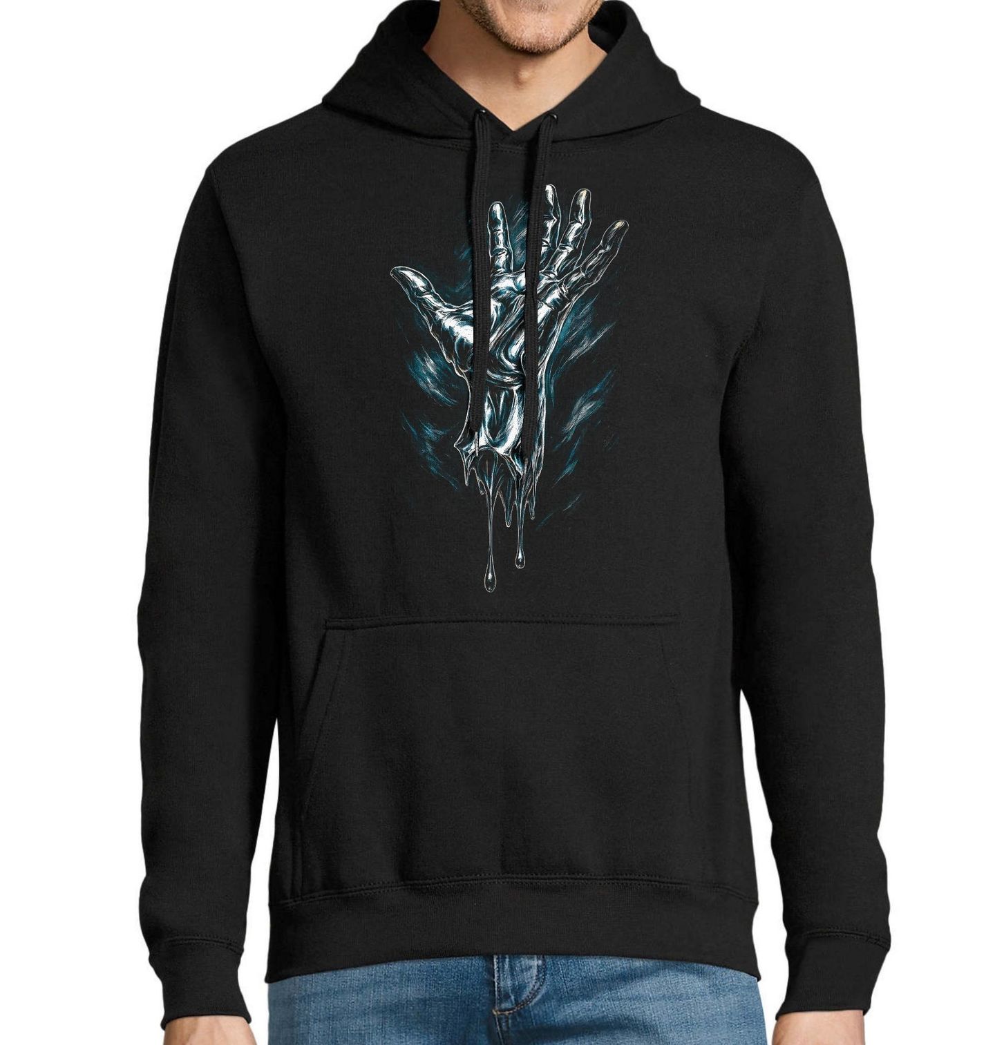Pánská mikina Tekutá Kovová Ruka. Temný a výrazný motiv zachycuje detailní ruka, která působí, jako by byla vytvořena z roztaveného kovu. Kapky stékající po jejím povrchu dodávají designu dynamiku a surovou energii, zatímco kovový lesk vytváří silný kontrast s temným pozadím. Tato ruka symbolizuje sílu, transformaci a znovuzrození – jako by prošla ohněm a vyšla silnější než kdy dřív.