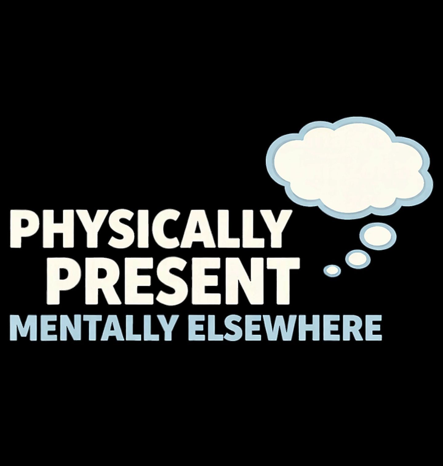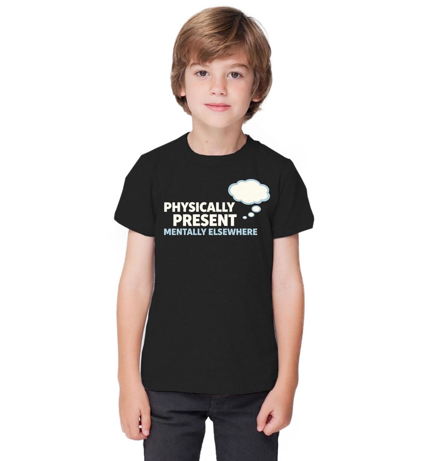 Dětské tričko Tělem Tady Hlavou Jinde. Vtipný motiv vystihuje každodenní nepřítomnost, kdy člověk sice působí, že je přítomný, ale myšlenkami je úplně jinde. Nápis PHYSICALLY PRESENT MENTALLY ELSEWHERE znamená „Fyzicky přítomný, mentálně jinde“ a dokonale popisuje stav rozptýlení i zasnění.