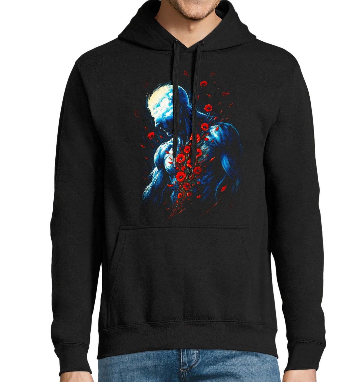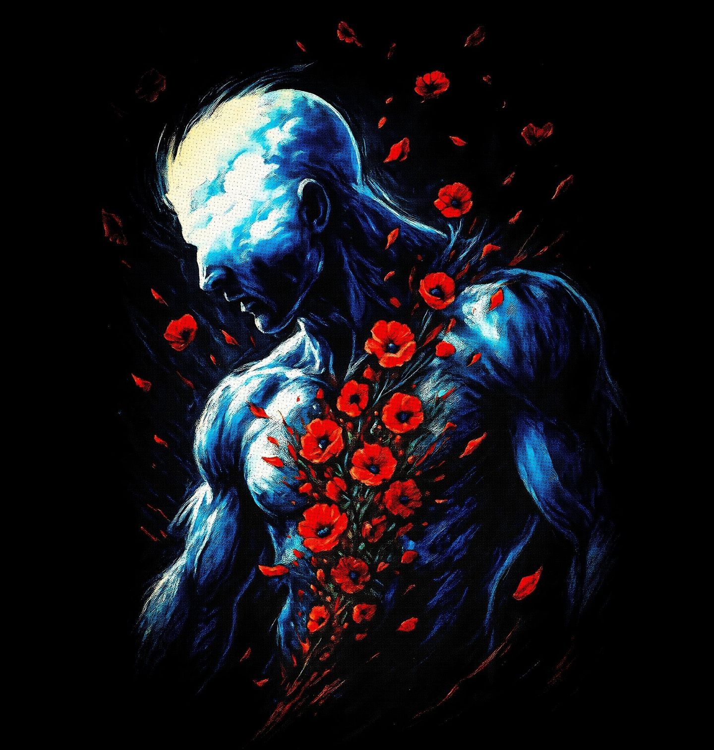 Pánská mikina Tělo v Rozkvětu. Postava představuje vnitřní boj, bolest i sílu, kterou si neseme uvnitř. Z těla vyrůstají květy, které kontrastují s napětím svalů a temnou atmosférou. Tento detail symbolizuje růst, naději a schopnost znovu se zvednout i po těžkých chvílích. Design zachycuje okamžik mezi bolestí a uzdravením – připomínku, že i v nejtěžších chvílích může vzniknout něco krásného.