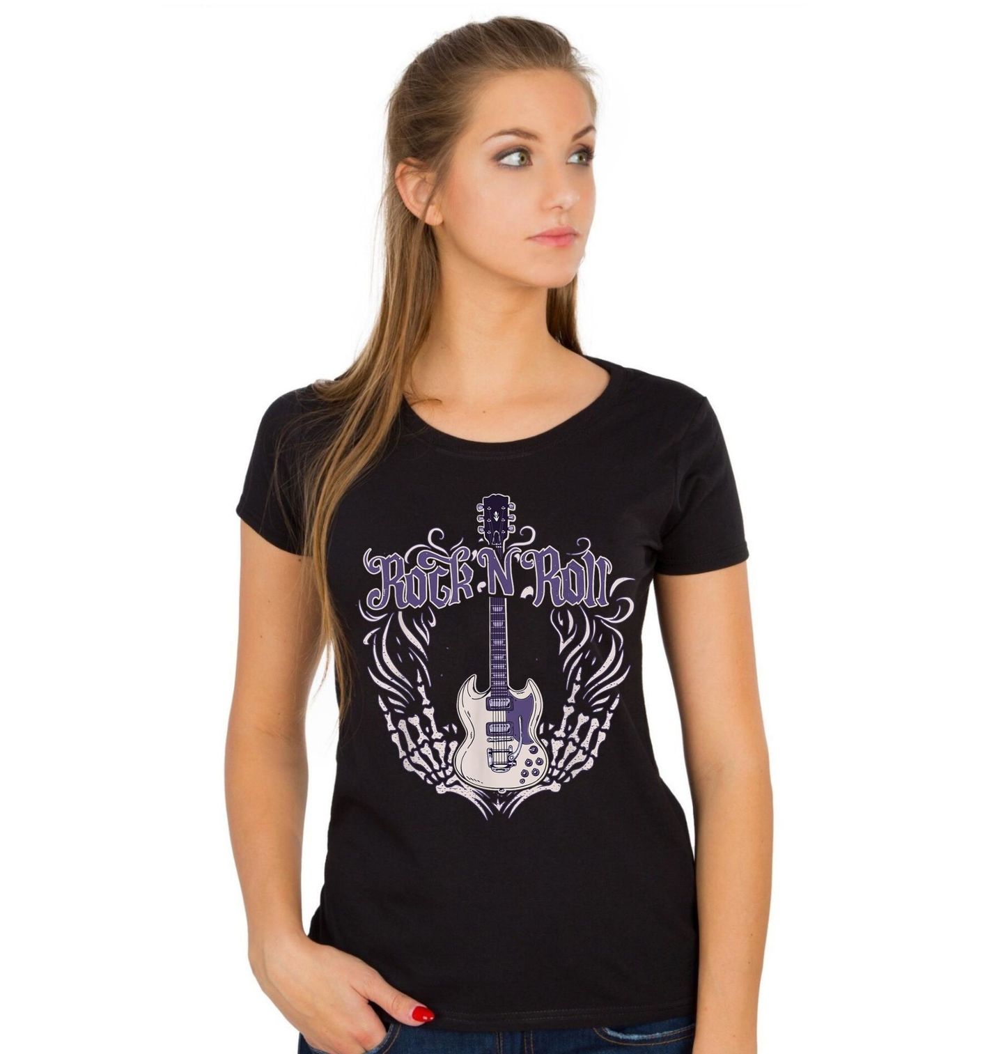 Dámské tričko Temná Kytara Rock N Rollu. Originální motiv s nápisem Rock N Roll zaujme výraznou elektrickou kytara v kombinaci s kostlivými křídly a temnými dekorativními prvky. Fialovo-černé provedení dodává designu tajemnou atmosféru a podtrhuje sílu, kterou rock and roll přináší. Kostěná křídla a dynamické linie kolem nástroje vytvářejí dojem pohybu a síly, která ožívá na koncertě i každá pořádná párty.