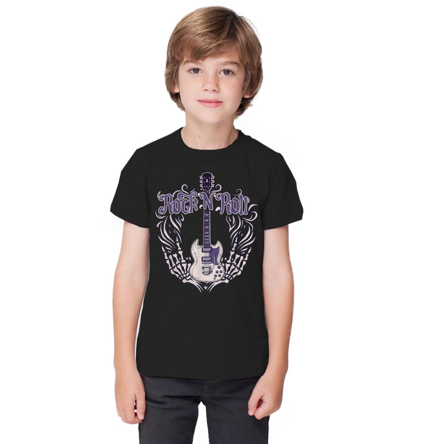 Dětské tričko Temná Kytara Rock N Rollu. Originální motiv s nápisem Rock N Roll zaujme výraznou elektrickou kytara v kombinaci s kostlivými křídly a temnými dekorativními prvky. Fialovo-černé provedení dodává designu tajemnou atmosféru a podtrhuje sílu, kterou rock and roll přináší. Kostěná křídla a dynamické linie kolem nástroje vytvářejí dojem pohybu a síly, která ožívá na koncertě i každá pořádná párty.