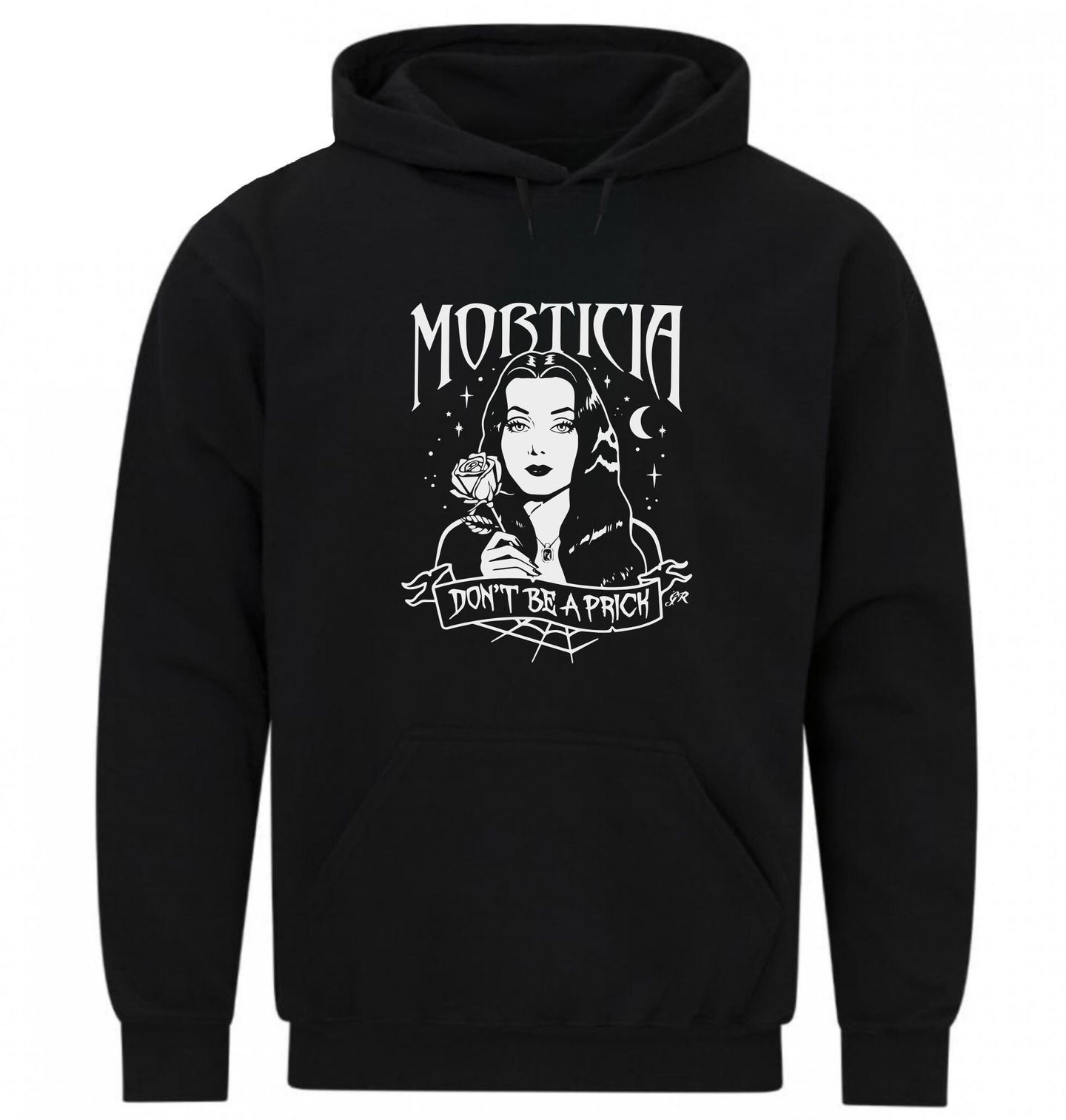 Pánská mikina Temná Morticie Addamsová. Morticia je parodie na Morticii Addamsovou ze slavné série The Addams Family. "Don't be a prick" (česky volně "Nebuď trn v oku") vtipně odkazuje na její oblíbené růže bez květů. Ideální pro všechny fanoušky gotiky, Addams Family a černého humoru.