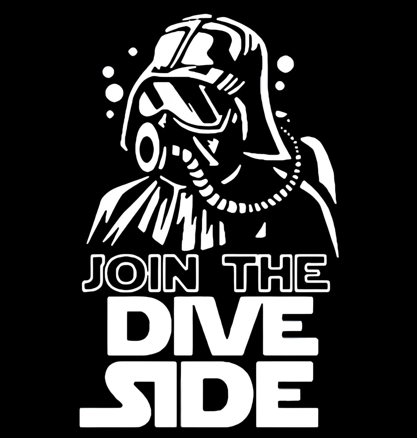 Pánské tričko Temná Strana Potápění Star Wars. Ilustrace připomínající ikonickou masku doplněná textem „JOIN THE DIVE SIDE“ („Přidej se na potápěčskou stranu“). Motiv je parodií na Hvězdné války. Kombinace humoru a popkulturního odkazu dělá z motivu ideální volbu pro potápěče i fanoušky sci-fi.