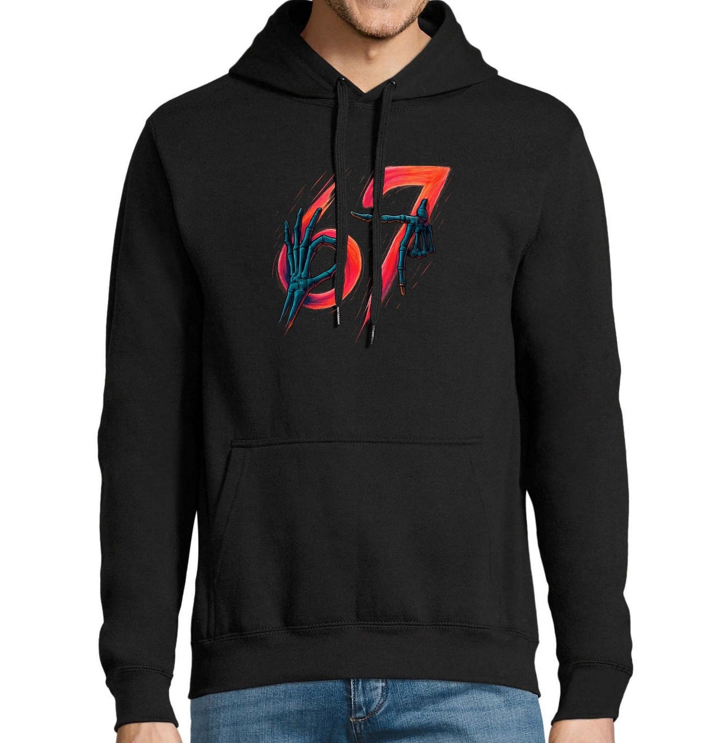 Pánská mikina Temný Kostlivec 67 Six Seven. Nebojíš se temnějších motivů? Pak je tenhle stylový design přesně pro tebe. Výrazné číslo 67 je zde doplněné o ruce kostlivce, které vytvářejí ikonická gesta a dávají motivu cool, trochu rebelský vzhled. Perfektní pro fanoušky alternativního stylu, humoru a netradičních potisků.