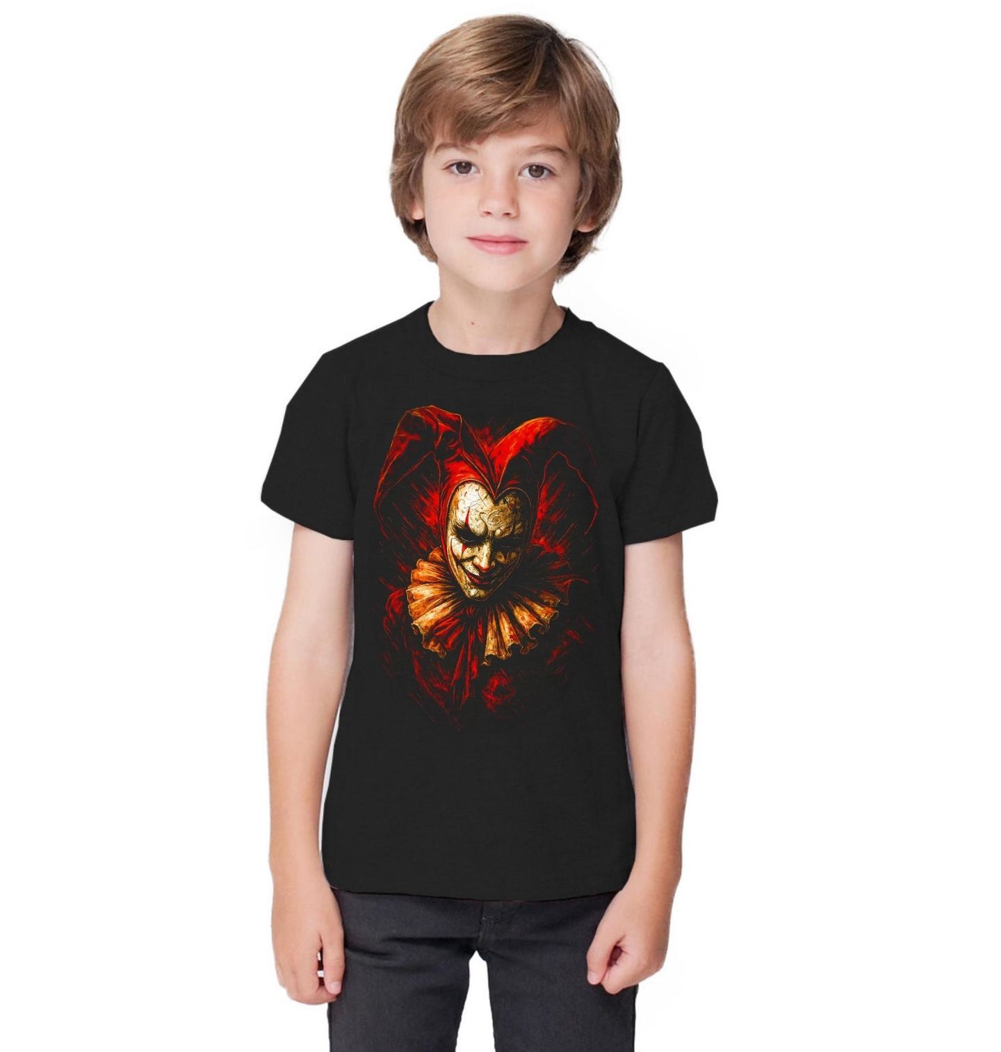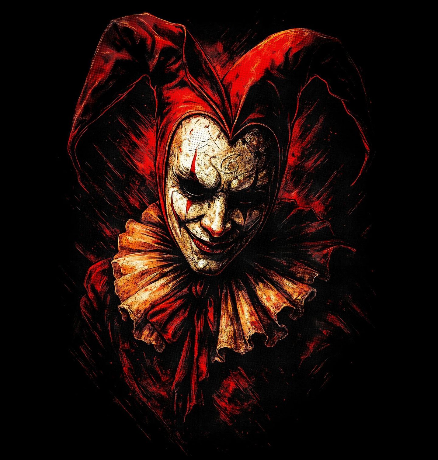 Dětské tričko Temný Královský Šašek. Děsivě fascinující motiv, který spojuje historii a temnou fantazii. Tento šašek, kdysi věrný služebník krále, zde získává nový, znepokojivý rozměr. Jeho výraz a maska vyvolávají pocit nejistoty – je to stále jen dvorní bavič, nebo něco mnohem temnějšího? Tento originální design staví na kontrastu mezi rolí, kterou měl šašek na královském dvoře, a jeho současným zobrazením jako tajemného a děsivého klauna.