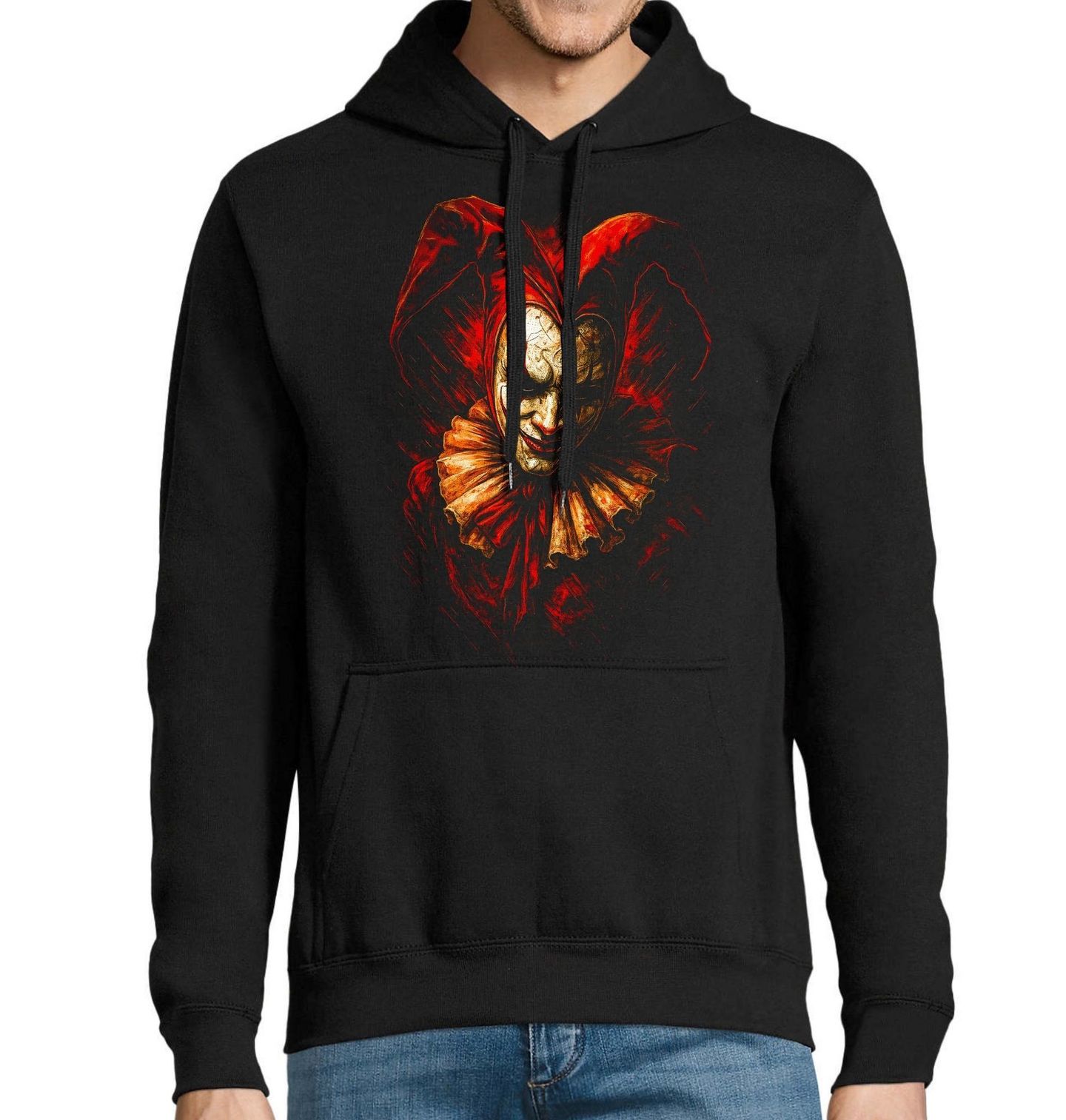 Pánská mikina Temný Královský Šašek. Děsivě fascinující motiv, který spojuje historii a temnou fantazii. Tento šašek, kdysi věrný služebník krále, zde získává nový, znepokojivý rozměr. Jeho výraz a maska vyvolávají pocit nejistoty – je to stále jen dvorní bavič, nebo něco mnohem temnějšího? Tento originální design staví na kontrastu mezi rolí, kterou měl šašek na královském dvoře, a jeho současným zobrazením jako tajemného a děsivého klauna.