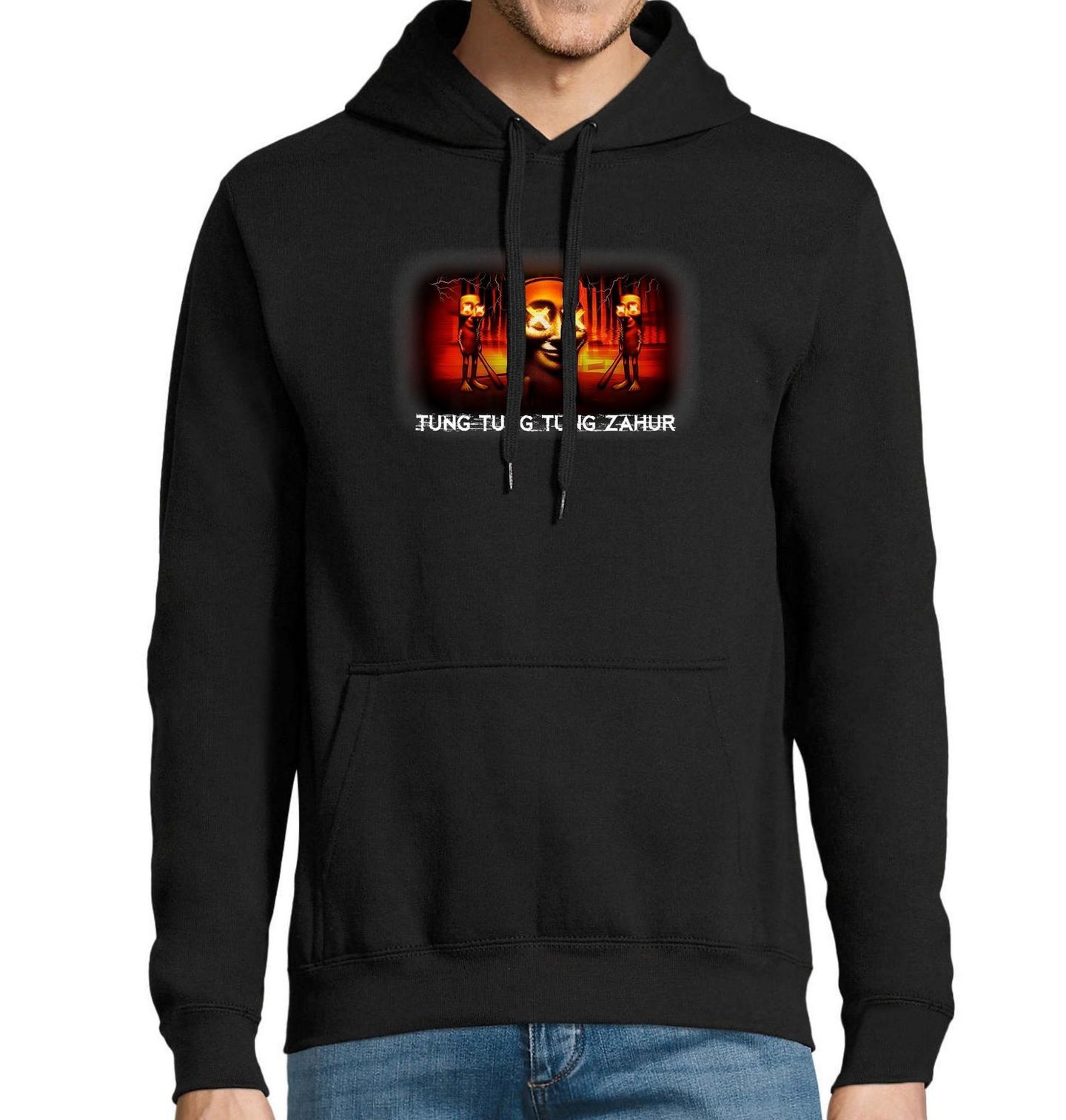 Pánská mikina Temný Tung Tung Tung Zahur. Toto tričko není pro slabé povahy. Tři znepokojivé postavy s X očima, glitchovou aurou a baseballkami v rukou se ti dívají přímo do duše. Vypadá to, že se právě probudily ze zapomenutého italského meme snu – italský brainrot ve své nejtemnější formě. „Tung Tung Tung Sahur“ už není jen vtip. Je to varování.