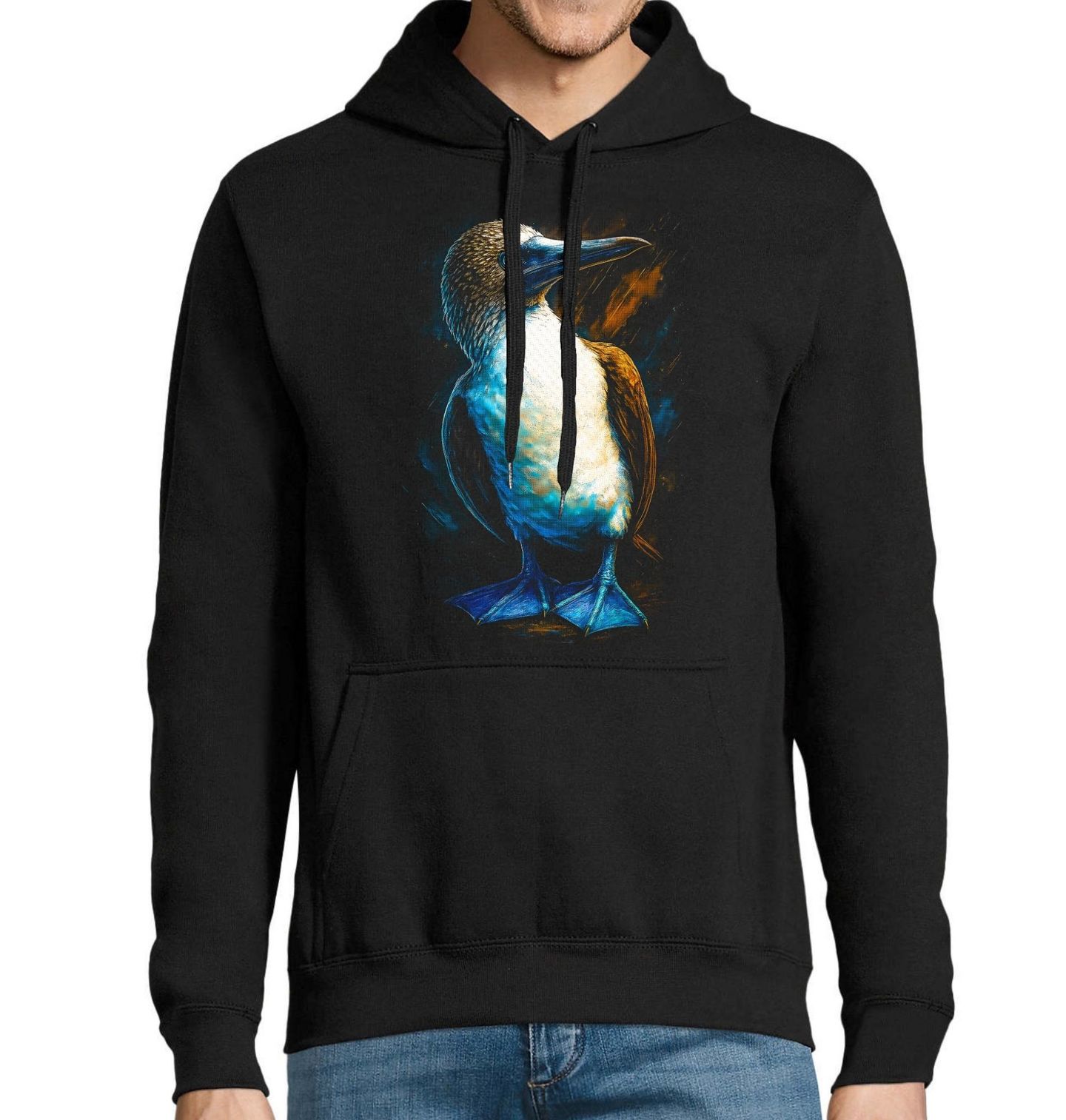 Pánská mikina Terej modronohý. Stylový motiv zachycuje ikonický pták terej modronohý (Sula nebouxii), který je známý svými výraznými modrými chodidly a elegantní postavou. Tento mořský pták obývá především Galapágy a pacifické pobřeží Jižní Ameriky, kde patří mezi nejzajímavější a nejfotografovanější druhy.
