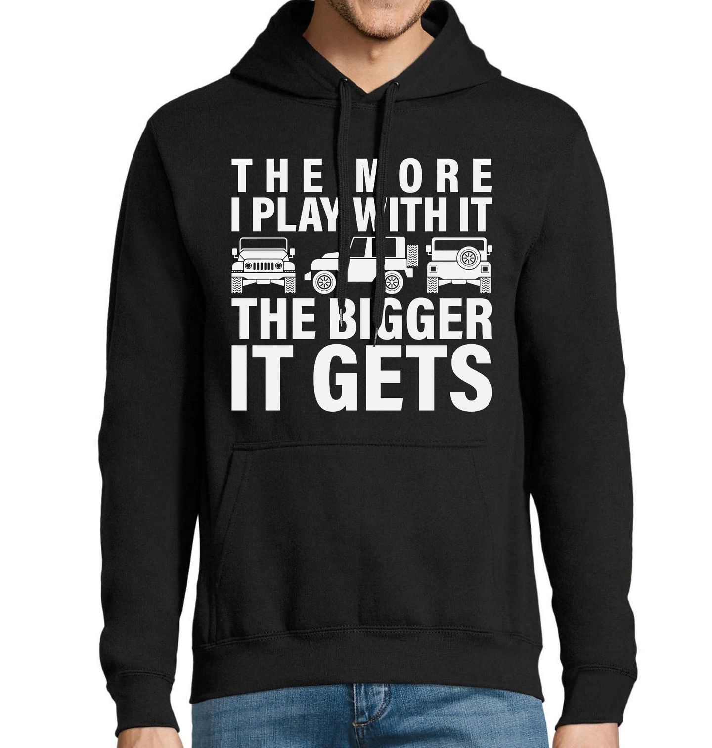 Pánská mikina Terénní Auto The More I Play with It. Vtipný a výrazný motiv pro každého, koho baví terenní auta a dobrodružství. Kombinuje stylové auto s textem „The More I Play With It, The Bigger It Gets“, což v překladu znamená „Čím víc si s tím hraju, tím větší to je.“ Tento design vystihuje radost z jízdy, výkon i nadsázku, které každé pořádné auto přináší.