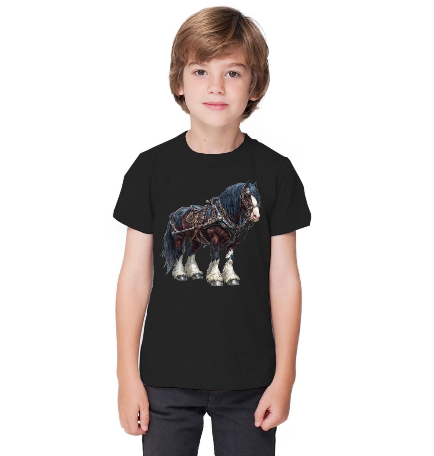 Dětské tričko Těžký Pracovní Kůň Clydesdale horse. Detailní ilustrace zachycuje majestátního tažného koně v plné postroji. Tento motiv zobrazuje kůň mohutné stavby těla s bohatou hřívou a typickými rousy na nohách. Vzhledem i proporcemi připomíná plemeno Shire nebo jiného těžkého chladnokrevníka, kteří byli využíváni jako pracovní a tažní koně na farmách i v lesnictví.