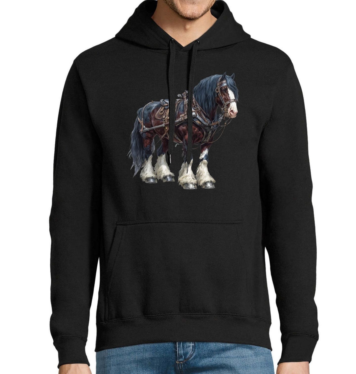 Pánská mikina Těžký Pracovní Kůň Clydesdale horse. Detailní ilustrace zachycuje majestátního tažného koně v plné postroji. Tento motiv zobrazuje kůň mohutné stavby těla s bohatou hřívou a typickými rousy na nohách. Vzhledem i proporcemi připomíná plemeno Shire nebo jiného těžkého chladnokrevníka, kteří byli využíváni jako pracovní a tažní koně na farmách i v lesnictví.