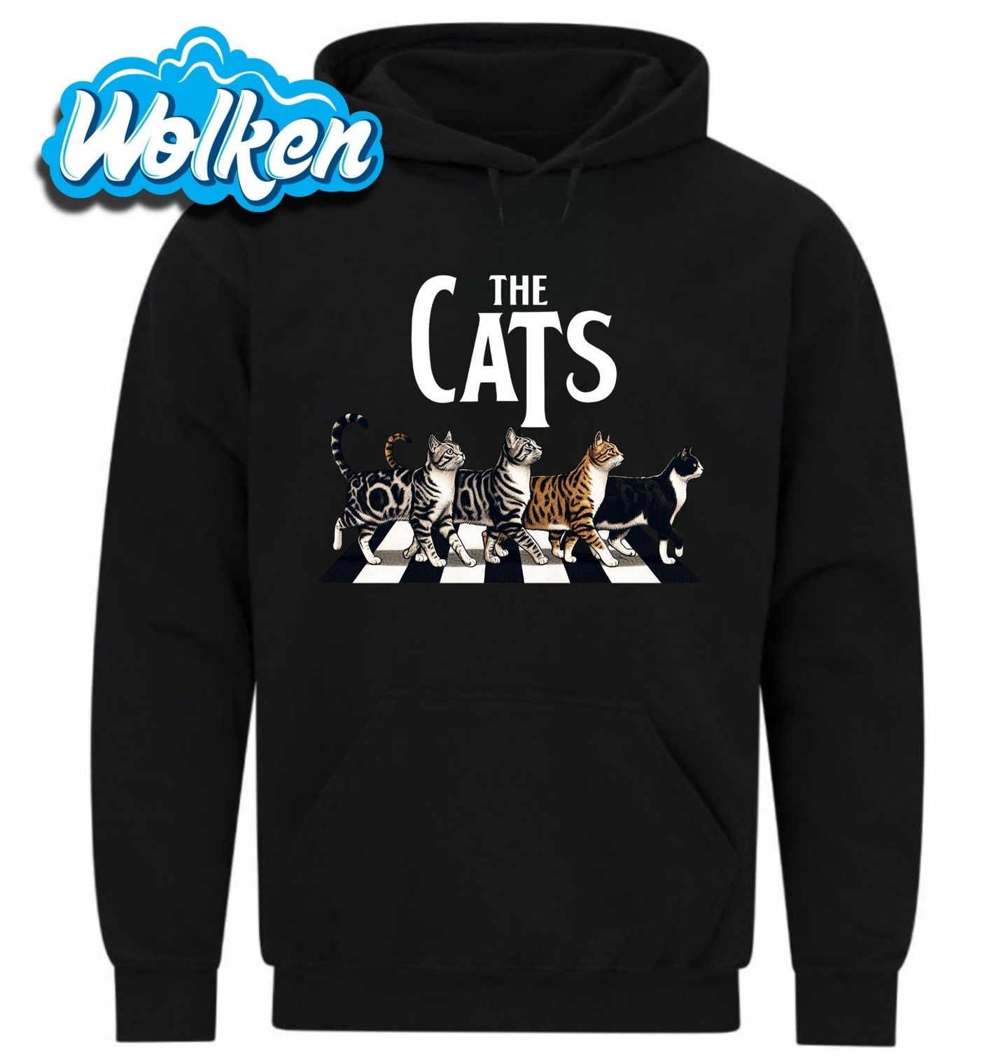 Pánská mikina The Cats Beatles Kočky Abbey Road. Tento zábavný motiv představuje kočičí verzi ikonického přechodu slavné skupiny The Beatles z jejich kultovního alba „Abbey Road“. Čtyři stylové kočky sebevědomě kráčí přes slavný přechod a svým jedinečným kočičím šarmem parodují jednu z nejznámějších fotografií hudební historie.