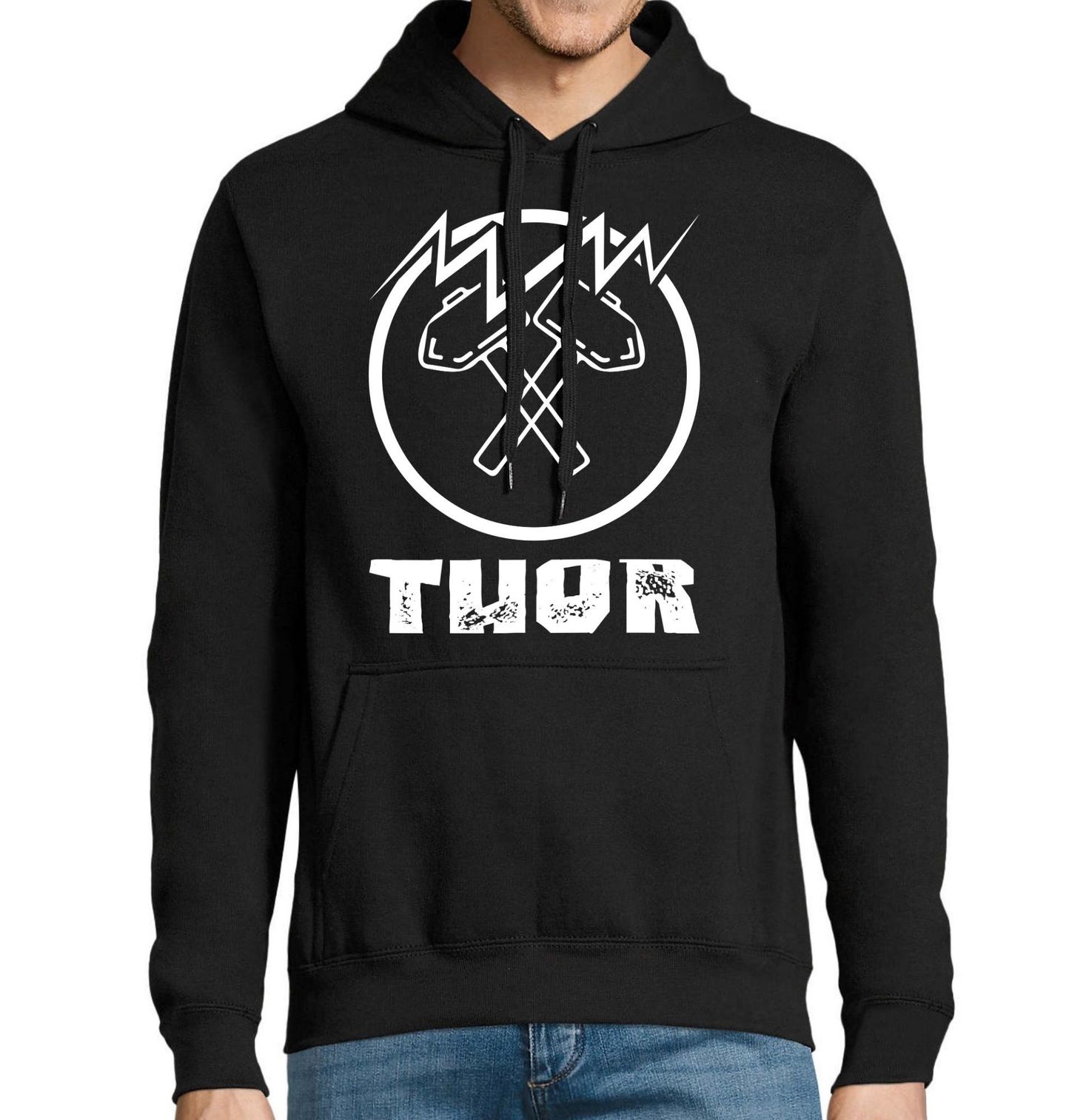 Pánská mikina Thor Síla Severského Boha. Tento výrazný design nese nápis „THOR“ a symbol zkřížených kladiv, které připomínají legendární zbraň Mjölnir. Motiv je inspirovaný severskou mytologií a bohem hromu Thorem, symbolem síly, ochrany a odvahy. Stylová grafika je ideální pro fanoušky Vikingů, mytologie a epických severských legend.