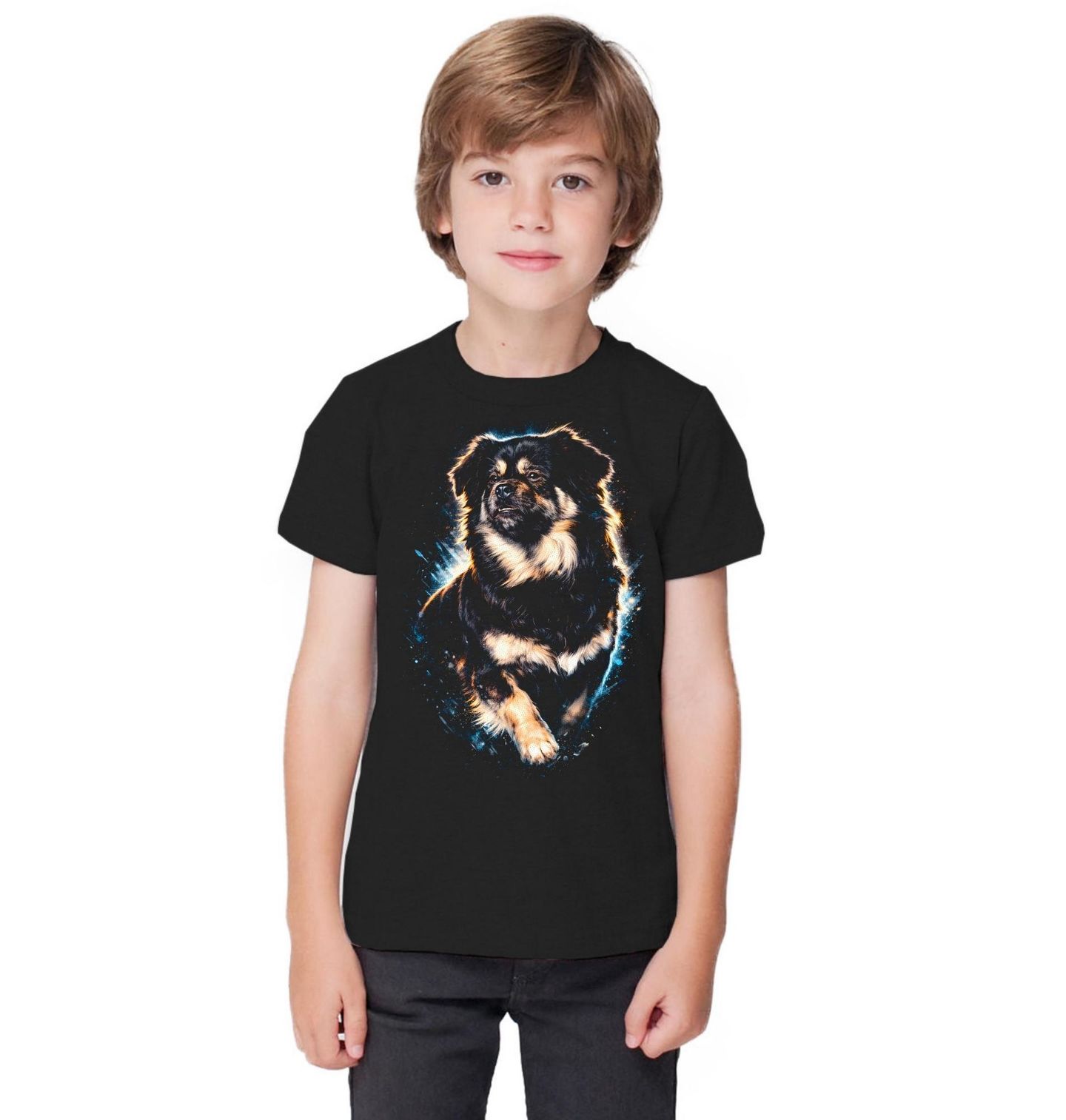 Dětské tričko Tibetský španěl. Tento působivý motiv zachycuje sebevědomého psa plemene Tibetský španěl v dynamickém pohybu, obklopeného kontrastními barvami, které zdůrazňují jeho jedinečný vzhled. Detailní ilustrace vystihuje hustou srst, typickou lví hřívu kolem krku a hrdý postoj, díky kterému je tento pes tak výjimečný. Skvělá volba pro každého pejskař, který chce vyjádřit svou lásku ke svému čtyřnohému parťákovi