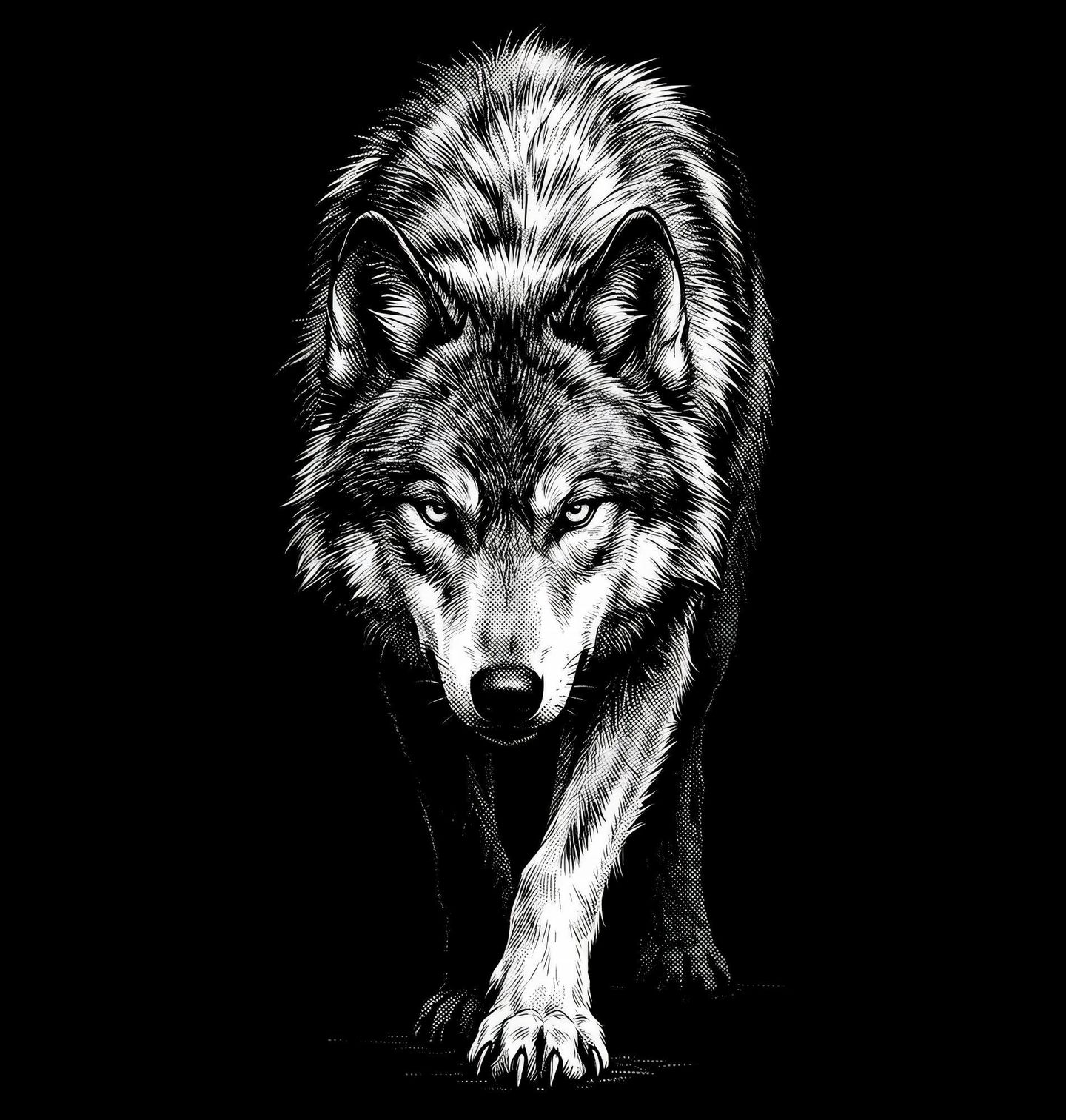 Dámské tričko Tichý Vlk na Lovu. Silný, tajemný a respekt vzbuzující motiv, který zachycuje vlk v jeho nejpřirozenější podobě – soustředěného, klidného a připraveného jednat. Tento design vyniká detailním černobílým zpracováním, které podtrhuje sílu, eleganci a divokou krásu přírody. Vlk zde symbolizuje nezávislost, odvahu a spojení s přírodou.