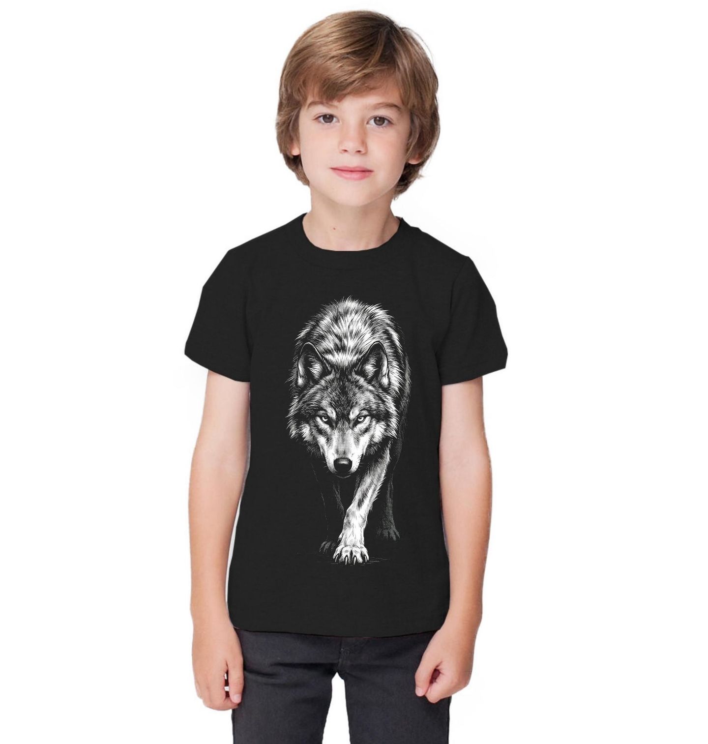 Dětské tričko Tichý Vlk na Lovu. Silný, tajemný a respekt vzbuzující motiv, který zachycuje vlk v jeho nejpřirozenější podobě – soustředěného, klidného a připraveného jednat. Tento design vyniká detailním černobílým zpracováním, které podtrhuje sílu, eleganci a divokou krásu přírody. Vlk zde symbolizuje nezávislost, odvahu a spojení s přírodou.