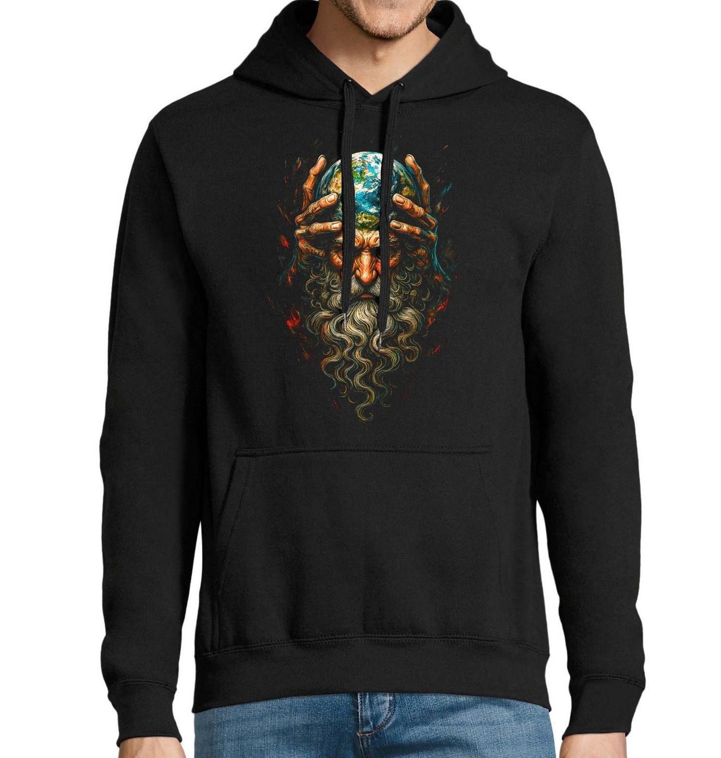 Pánská mikina Titán Atlas. Silný a temný motiv zachycuje Titána Atlase v dramatickém okamžiku, kdy na svých bedrech nese celý svět. Řecká mytologie vypráví, že Atlas byl po porážce Titánů Diem odsouzen držet nebeskou klenbu navždy. Stal se symbolem vytrvalosti, odpovědnosti a nezlomné síly. Intenzivní výraz tváře, napjaté ruce a planeta Země sevřená v jeho dlaních vytvářejí působivý vizuální obraz tíhy, kterou každý z nás někdy cítí.