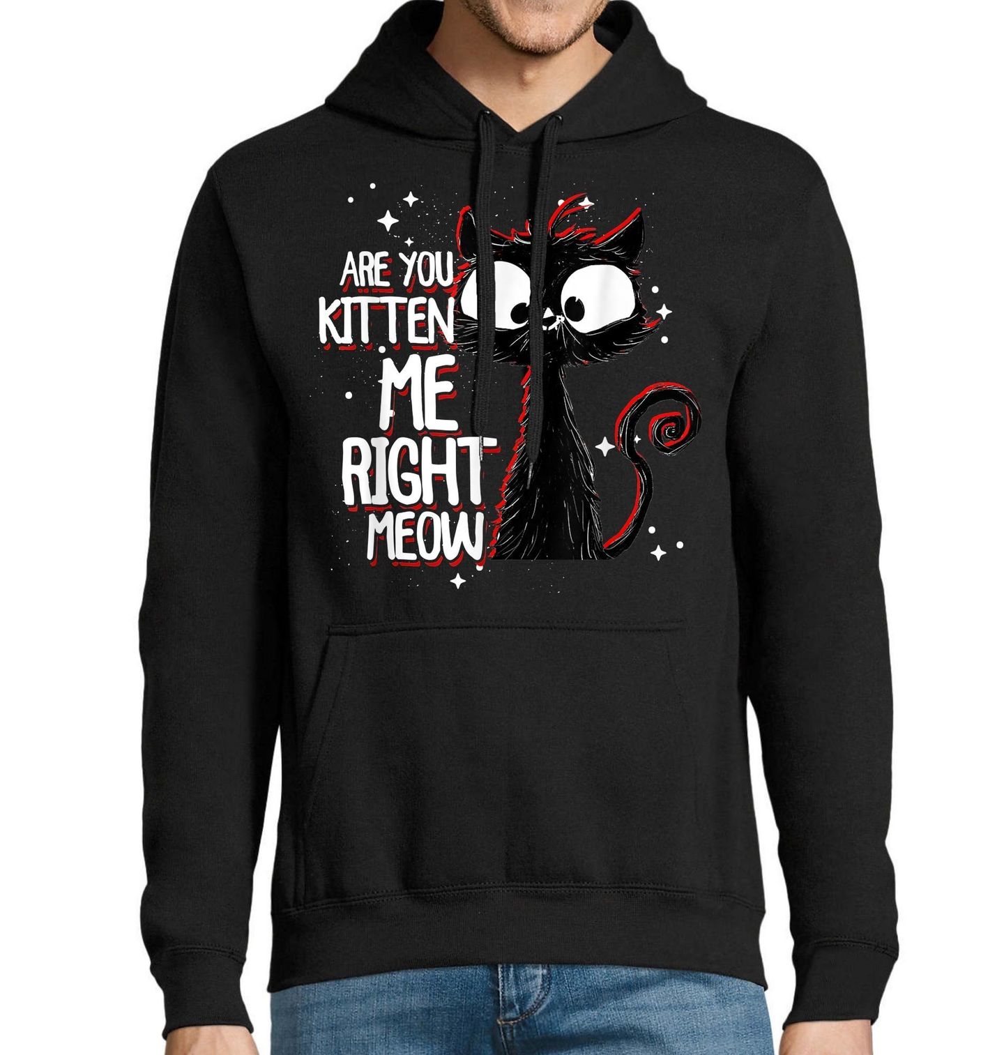 Pánská mikina To Myslíš Vážně Mňau. Vtipná černá velkooká kočka doplněná textem „Are you kitten me right meow“ (volně přeloženo „Děláš si ze mě koťátko právě teď?“) využívá slovní hříčku. Ideální motiv pro milovníky koček a hravého humoru.