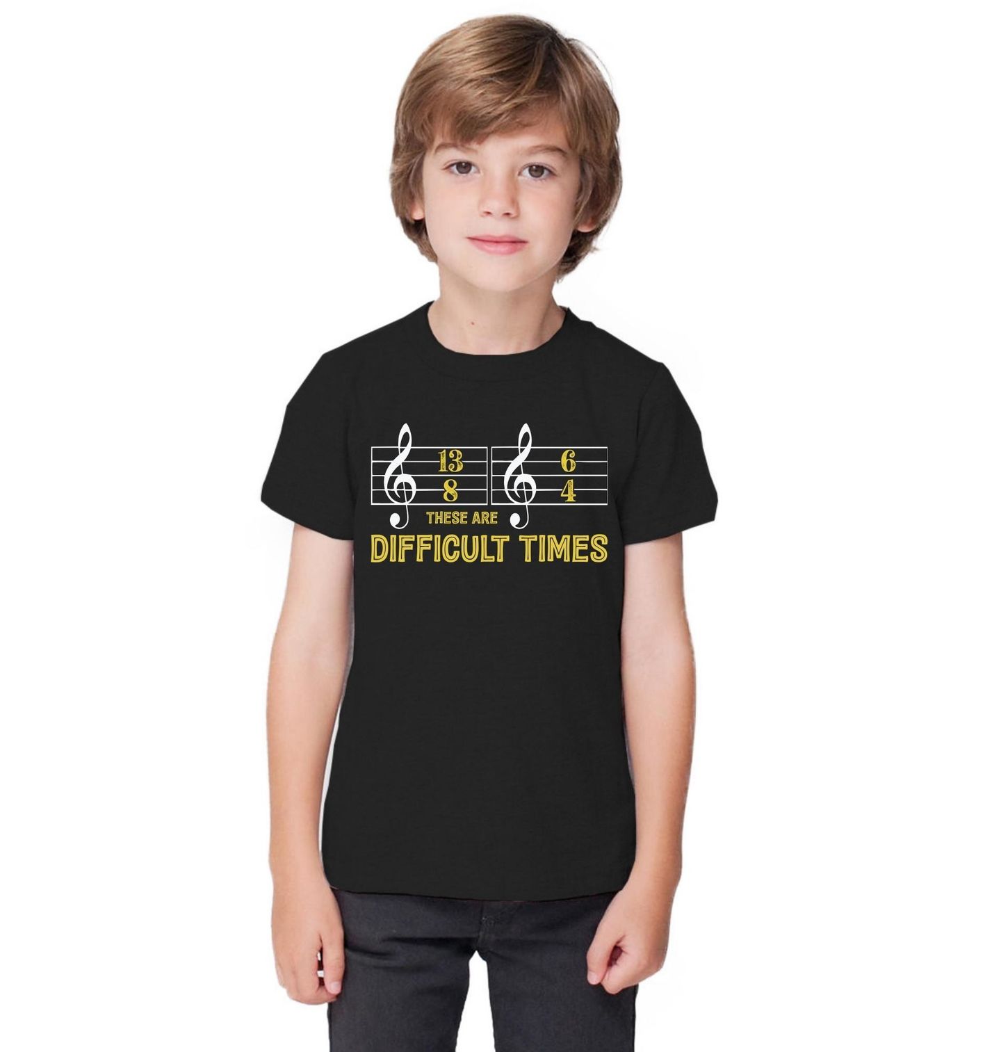 Dětské tričko Tohle jsou těžké rytmy. Tento originální motiv potěší každého, kdo má rád hudbu a rozumí jejím detailům. Nápis „These Are Difficult Times“ doplňují noty s neobvyklými taktovými označeními 13/8 a 6/4, které symbolizují rytmicky náročné pasáže. „Těžké časy“ = těžké rytmy.
