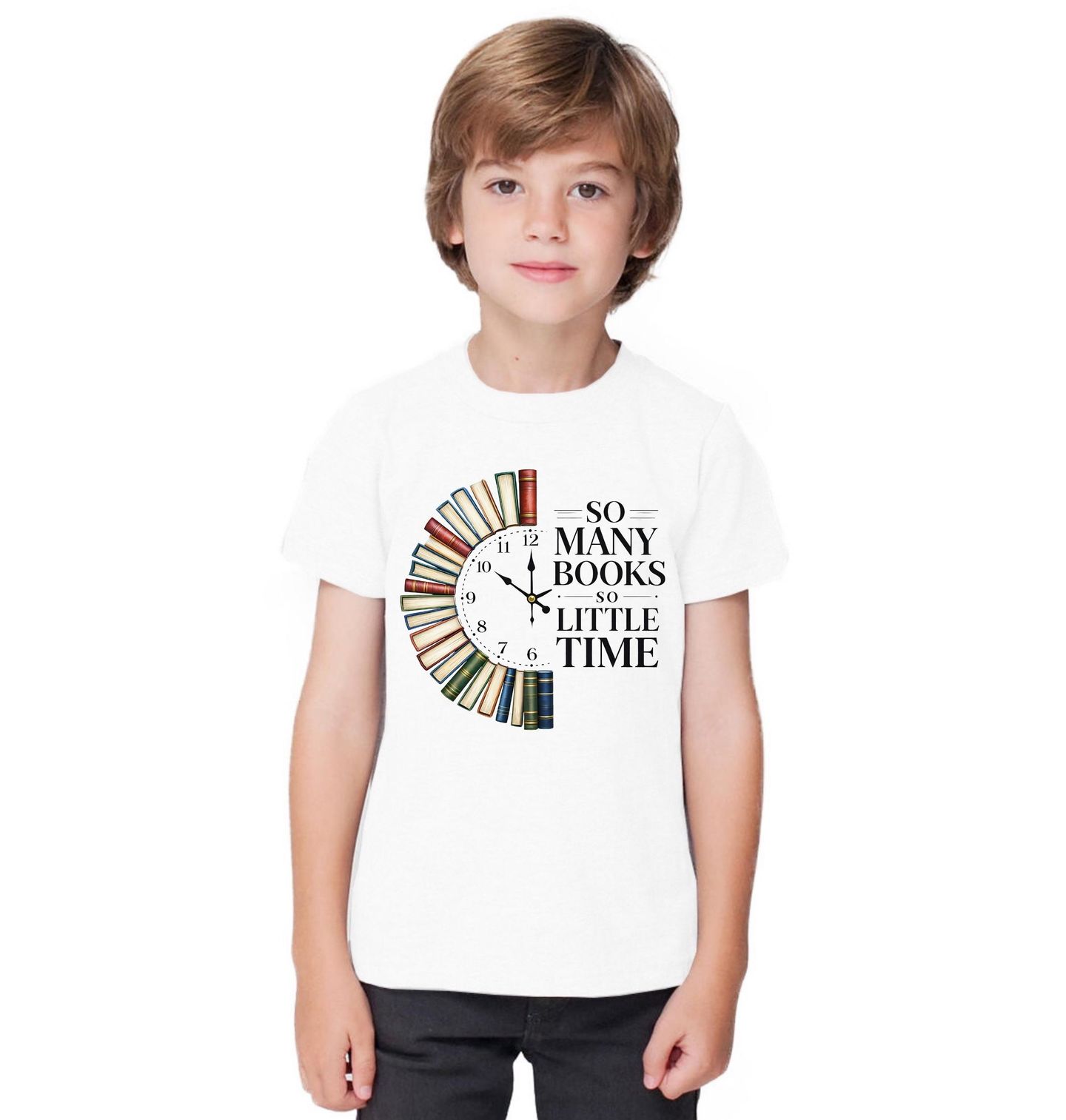 Dětské tričko Tolik Knih, tak Málo Času. Originální motiv hodin vytvořených z knih s textem „SO MANY BOOKS SO LITTLE TIME“ (Tolik knih, tak málo času) dokonale vystihuje vášeň pro čtení. Stylový design potěší každého knihomola. Perfektní pro milovníky knih, čtení a knihovních motivů.