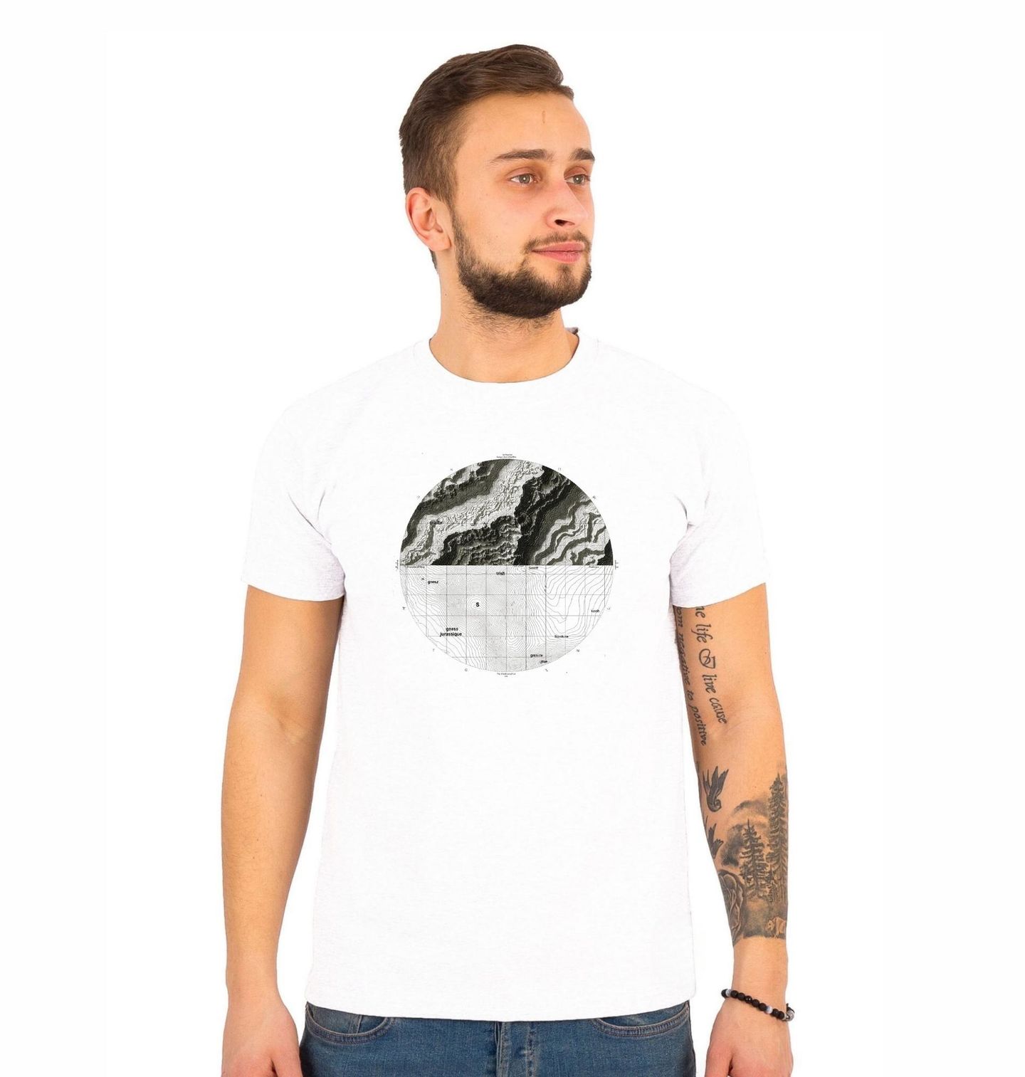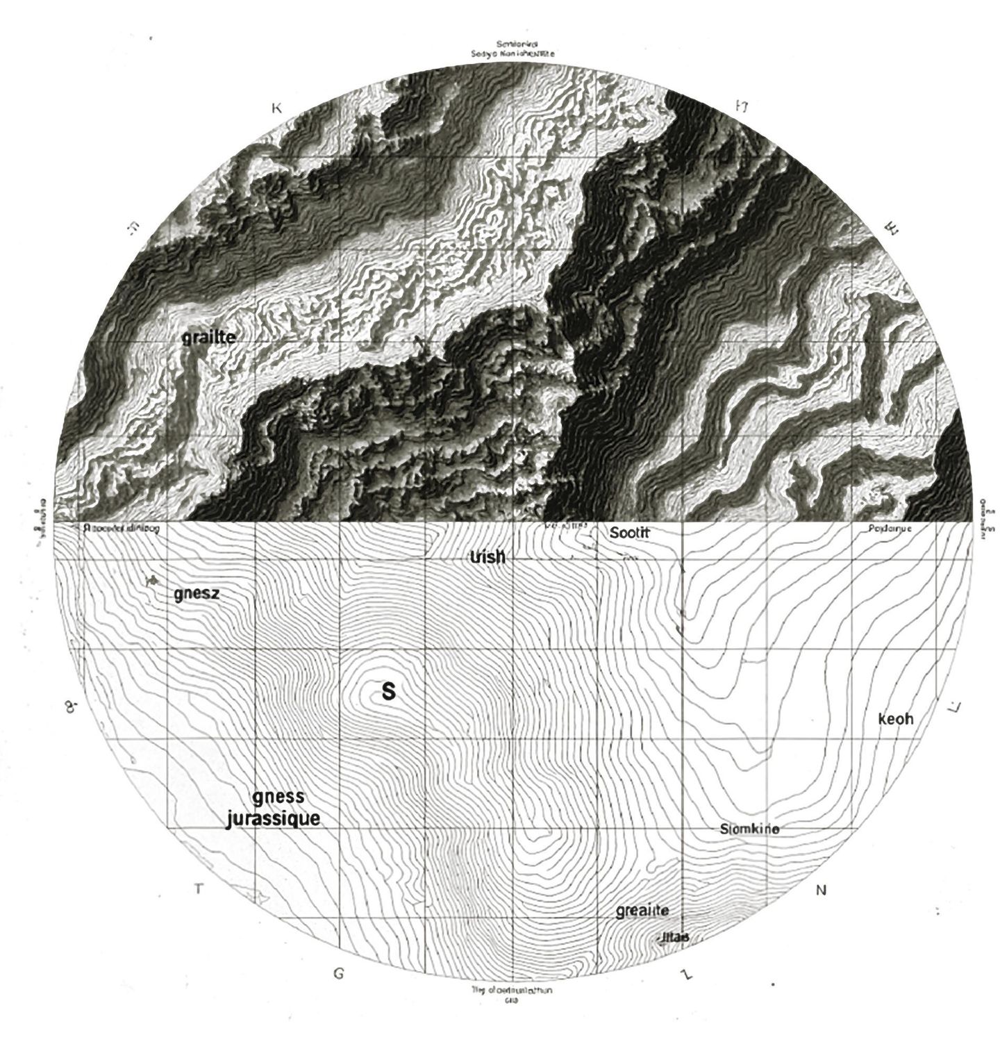 Pánské tričko Topografická Mapa Typy Hornin. V horní části obrázku je zobrazen terén s výraznými stíny a vrstevnicemi. Na mapě jsou identifikovány horniny jako žula (granite), rula (gnesz) a jurská rula (gness jurassique). Skvěle se hodí pro milovníky přírody, geografie, kartografie, hor, cestování i designu.
