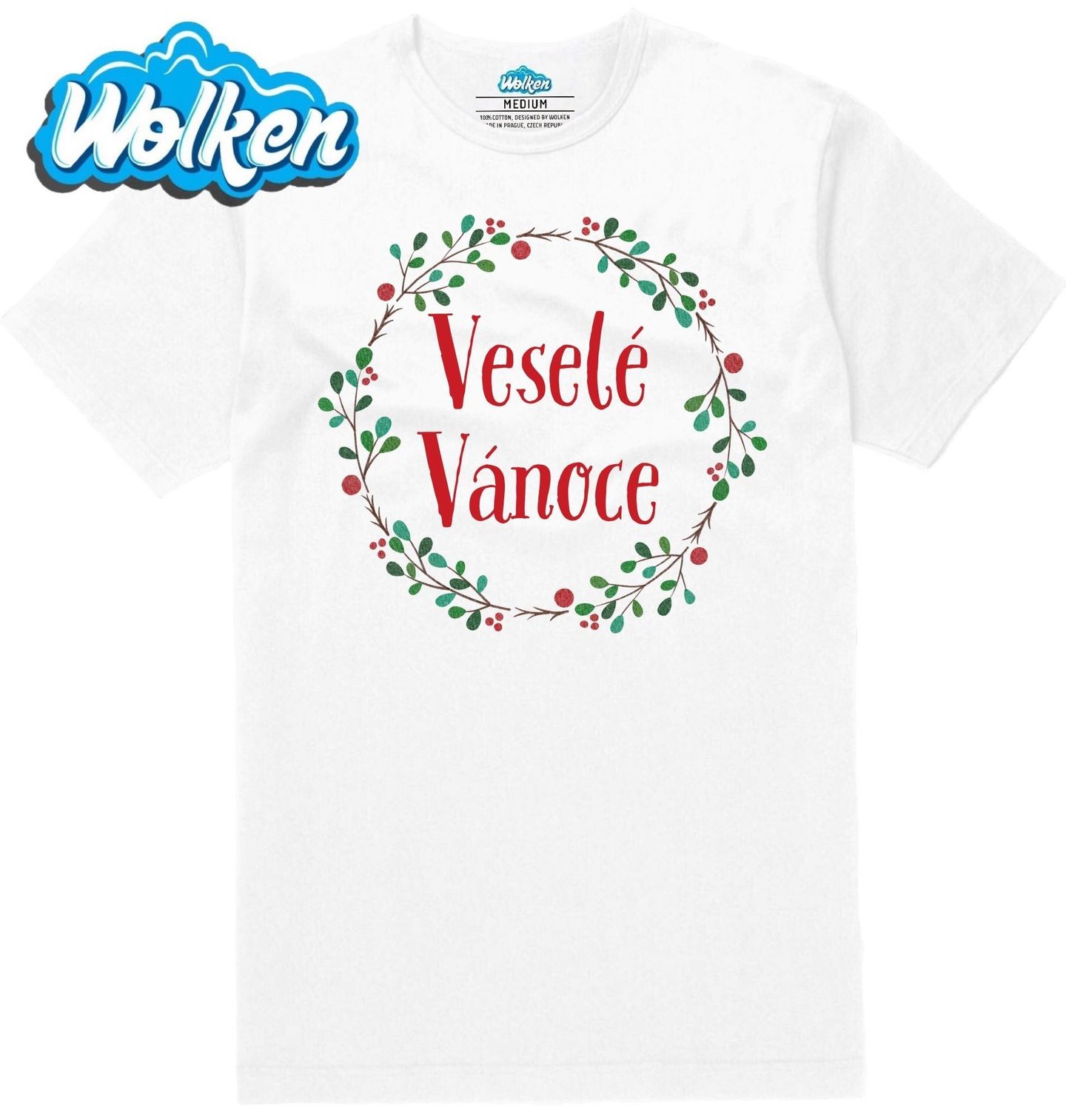 Pánské tričko Tradiční České Veselé Vánoce. Vánoce jsou časem radosti, klidu a návratu k tradicím. Tento motiv s přáním „Veselé Vánoce“ je zasazený do nádherného věnce z větviček, lístků a bobulek v přírodních tónech červené a zelené. Ideální pro všechny, kteří milují jemné, rustikální vánoční motivy s nádechem elegance a přírody.