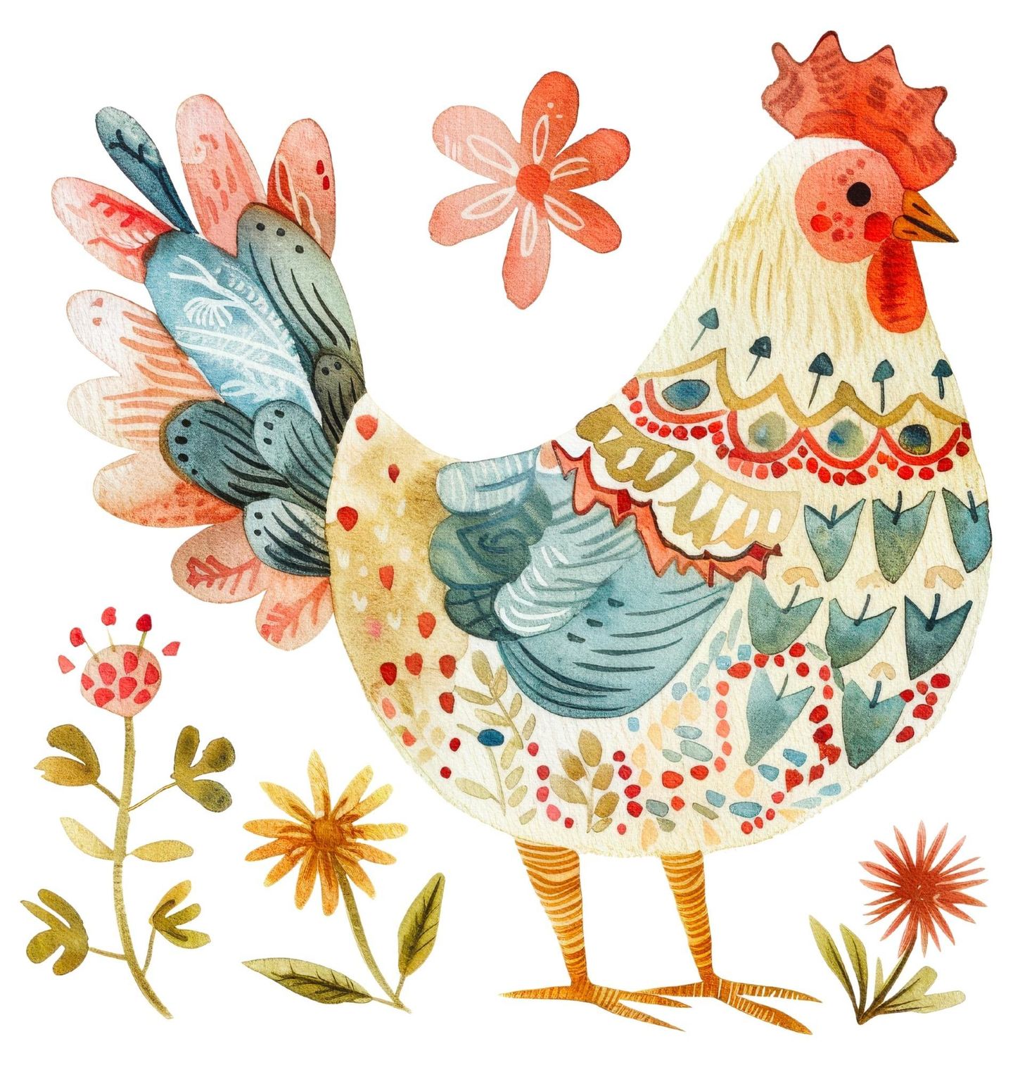 Dámské tričko Tradiční Slepička Folk. Tento hravý motiv zobrazuje slepici v jemném malovaném stylu plném barev, květin a detailů inspirovaných přírodou. Kombinace teplých tónů a dekorativních prvků vytváří příjemný folk vzhled, který působí lehce, radostně a přirozeně. Slepice je stylizovaná tak, aby evokovala klidný život na venkově, kde farma znamená pohodu, jednoduchost a spojení s přírodou.