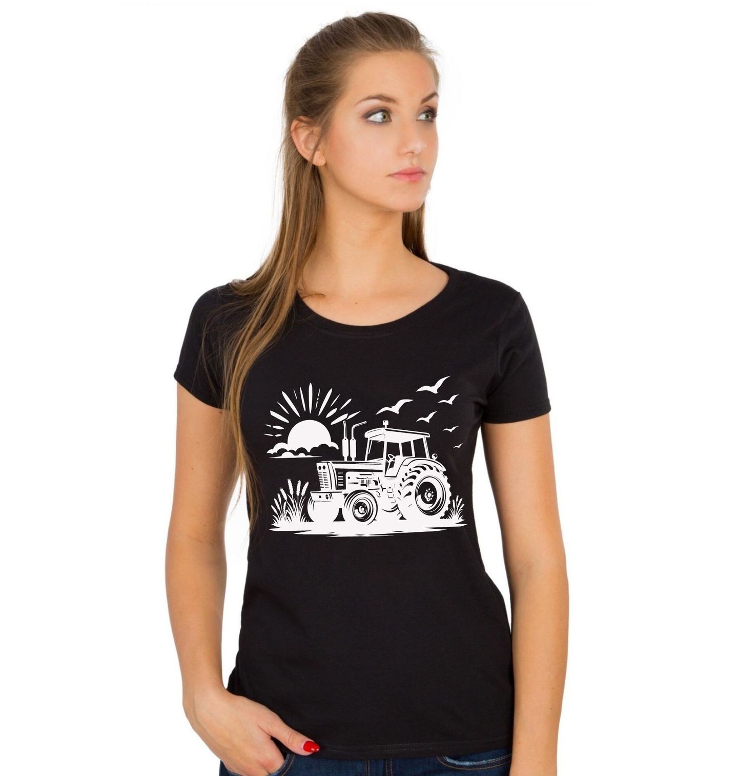 Dámské tričko Traktor na Poli při Východu Slunce. Stylový motiv zachycuje traktor na poli v klidné atmosféře venkova, kde farma ožívá s prvními paprsky slunce. Tento design symbolizuje poctivou práci, tradici a spojení člověka s přírodou. Každý farmář ví, že právě traktor je srdcem každé farmy a nepostradatelným pomocníkem při každodenní práci na poli. Skvělý dárek pro každého, kdo miluje traktor, pole a autentickou atmosféru, kterou farma přináší.