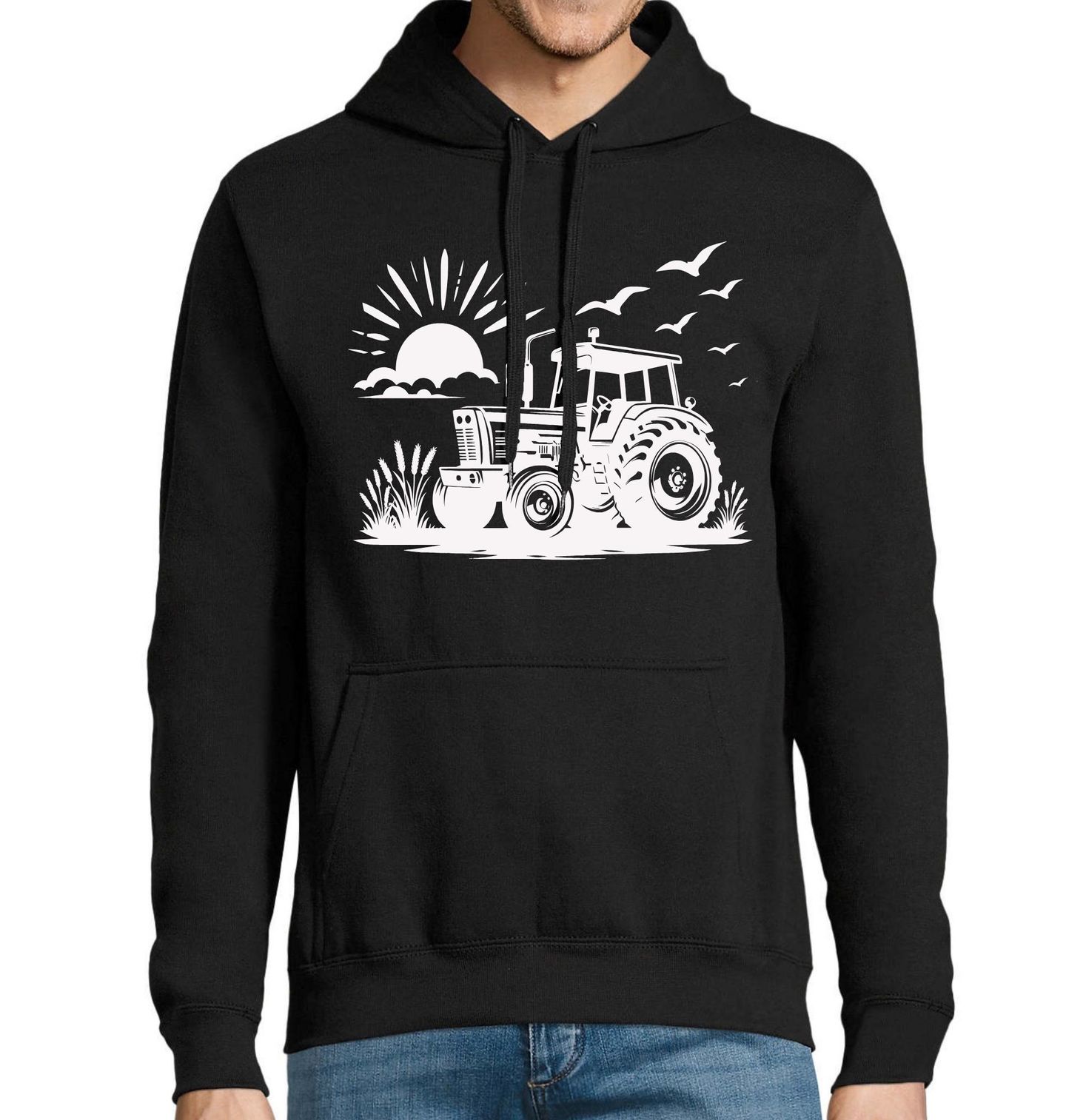 Pánská mikina Traktor na Poli při Východu Slunce. Stylový motiv zachycuje traktor na poli v klidné atmosféře venkova, kde farma ožívá s prvními paprsky slunce. Tento design symbolizuje poctivou práci, tradici a spojení člověka s přírodou. Každý farmář ví, že právě traktor je srdcem každé farmy a nepostradatelným pomocníkem při každodenní práci na poli. Skvělý dárek pro každého, kdo miluje traktor, pole a autentickou atmosféru, kterou farma přináší.