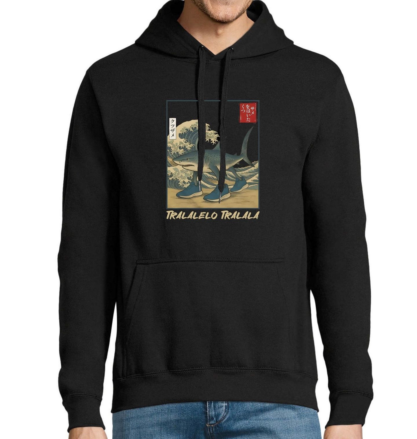 Pánská mikina Tralalero Tralala u Kanagawy. Když se potká Velká vlna u Kanagawy od Hokusaiho s italským brainrotem, vznikne neodolatelné meme tričko. Tahle absurdní kombinace žraloka v teniskách, co si to štráduje pláží ve stylu „Tralalero Tralala“, je přesně ten chaos, který potřebuješ ve svém šatníku.