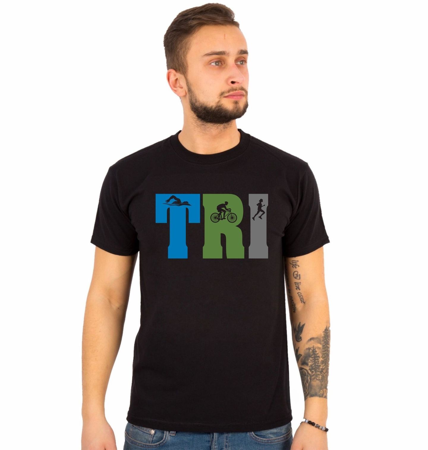 Pánské tričko Tři Disciplíny Triatlonu TRI. Minimalistický sportovní motiv, který jasně vyjadřuje podstatu vytrvalostního sportu. Design spojuje tři disciplíny do jednoho silného vizuálu: plavání, kolo a běh, které dohromady tvoří triatlon. Každé písmeno symbolizuje jednu fázi závodu a společně vytváří jednoduchý, ale výrazný motiv pro všechny fanoušky triatlonu.