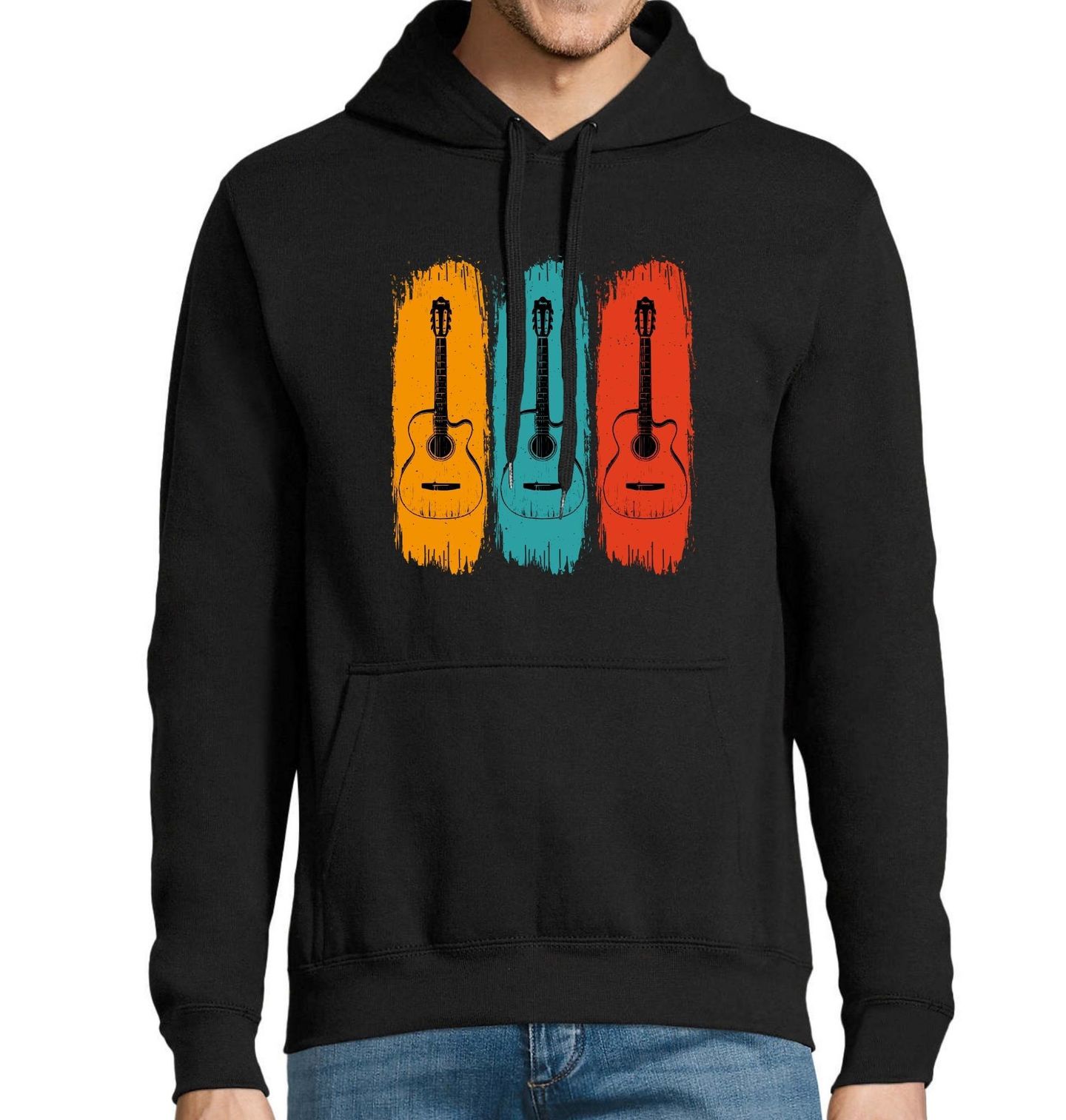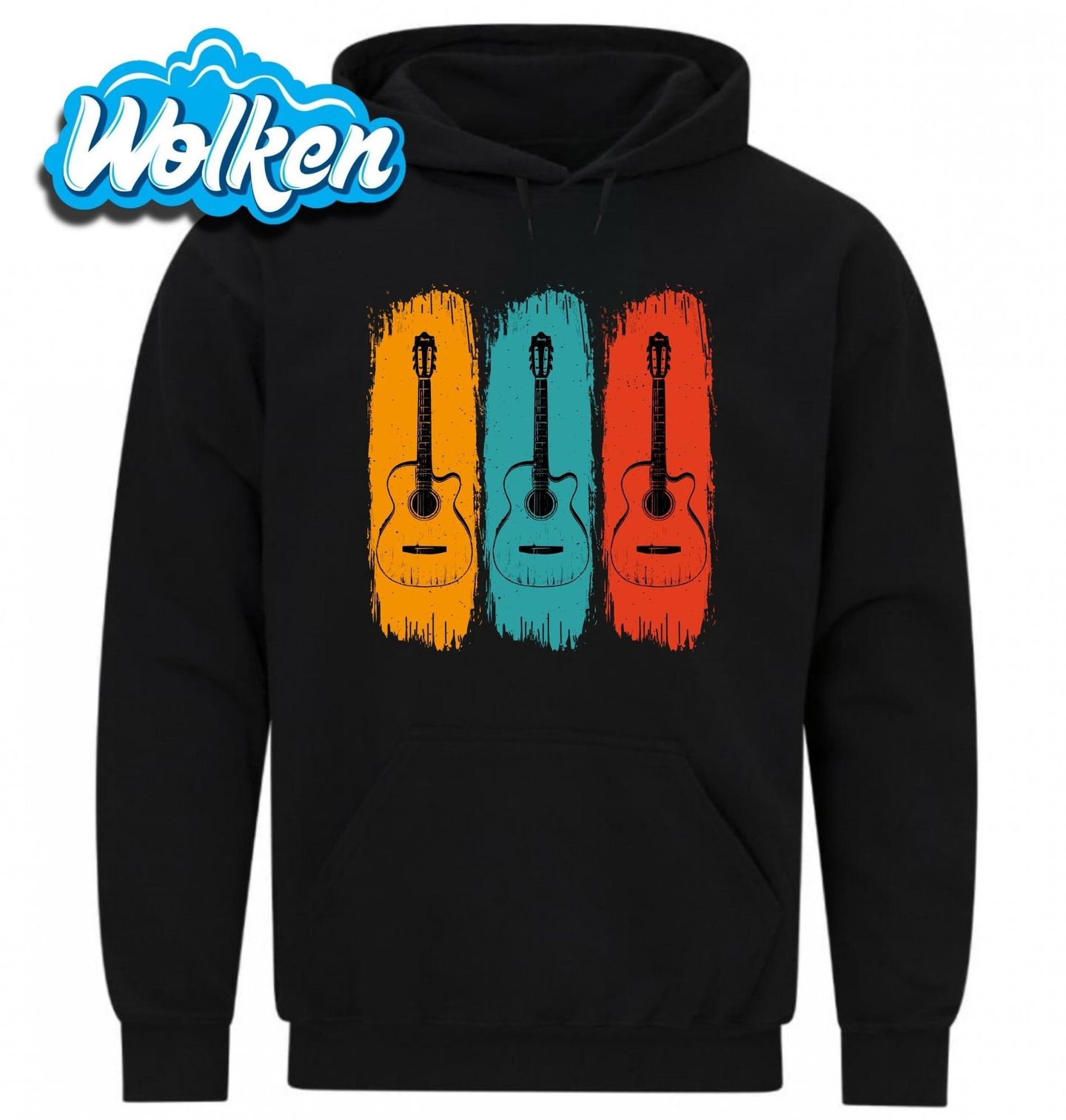 Pánská mikina Tři kytary Paleta Barev. Tři akustické kytary, tři barvy, jeden rytmus. Stylový design s retro nádechem pro všechny, kdo milují hudbu i vizuální originalitu. Ideální pro každého, komu v duši zní akordy a kdo ví, že život je nejhezčí, když hraje ve více barvách.