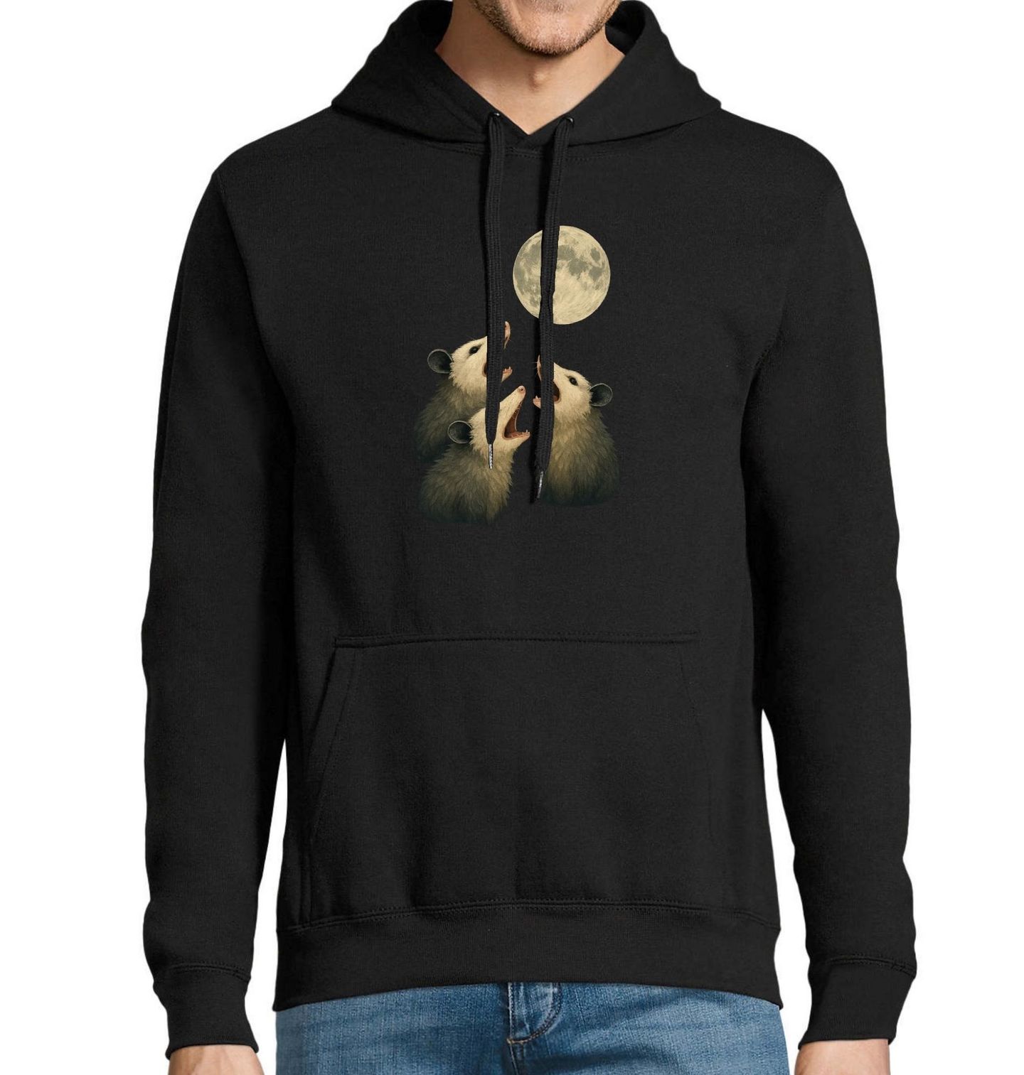 Pánská mikina Tři vačice vyjící k Úplňku. Originální tričko s humorným a zároveň tajemným motivem tří vačic, které vyjí směrem k jasně zářícímu měsíci na noční obloze. Ilustrace připomíná legendární „Three Wolf Moon“, ale v neotřelém zvířecím podání. Skvělá volba pro milovníky divoké přírody, měsíčních nocí i sarkastického humoru.