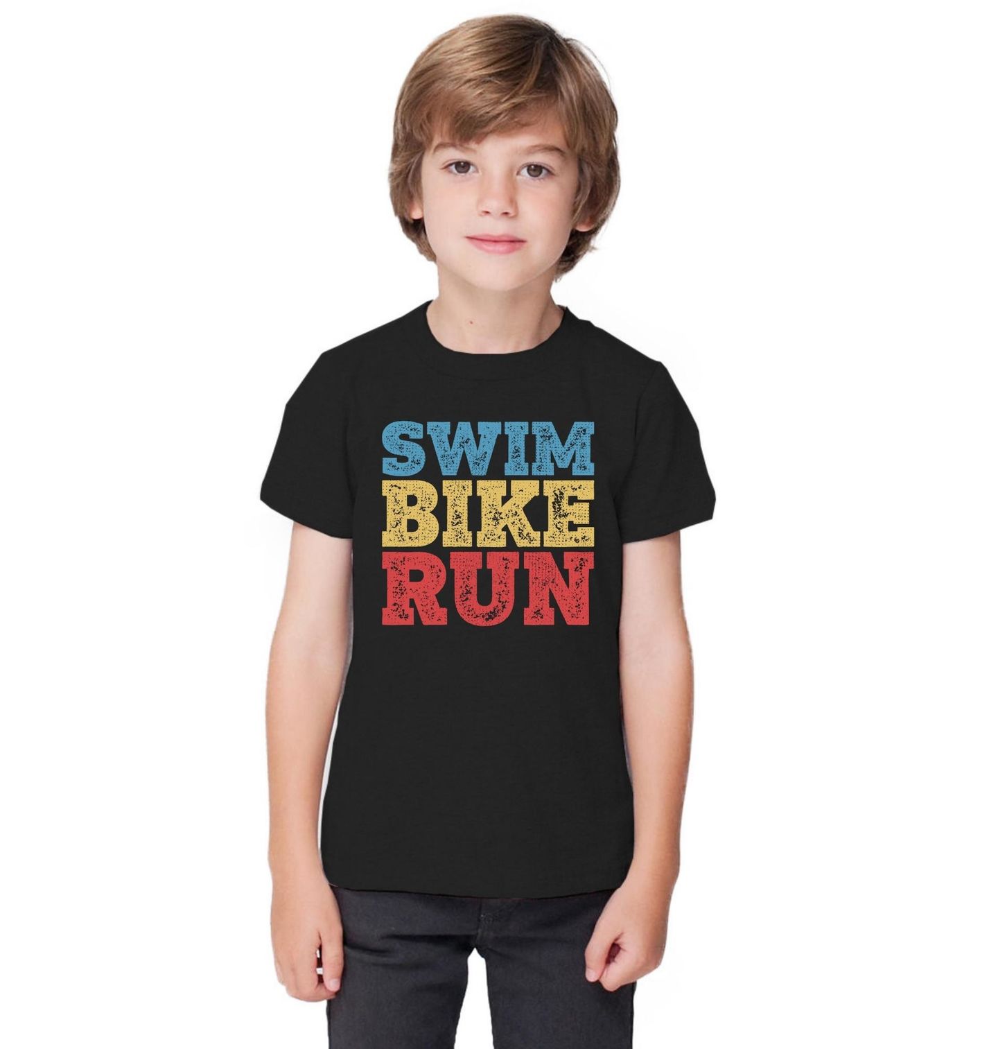 Dětské tričko Triatlon Plavání Kolo Běh Swim Bike Run. Barevný a energický motiv „Swim Bike Run“ je ideální pro všechny, kteří milují běh a sport v jeho komplexní podobě. Typografický design s výraznými barvami symbolizuje všestrannost, vytrvalost a radost z pohybu, ať už jde o trénink nebo závod. Tento motiv osloví triatlonisty, vytrvalostní sportovce i všechny aktivní lidi, pro které je sport životním stylem.