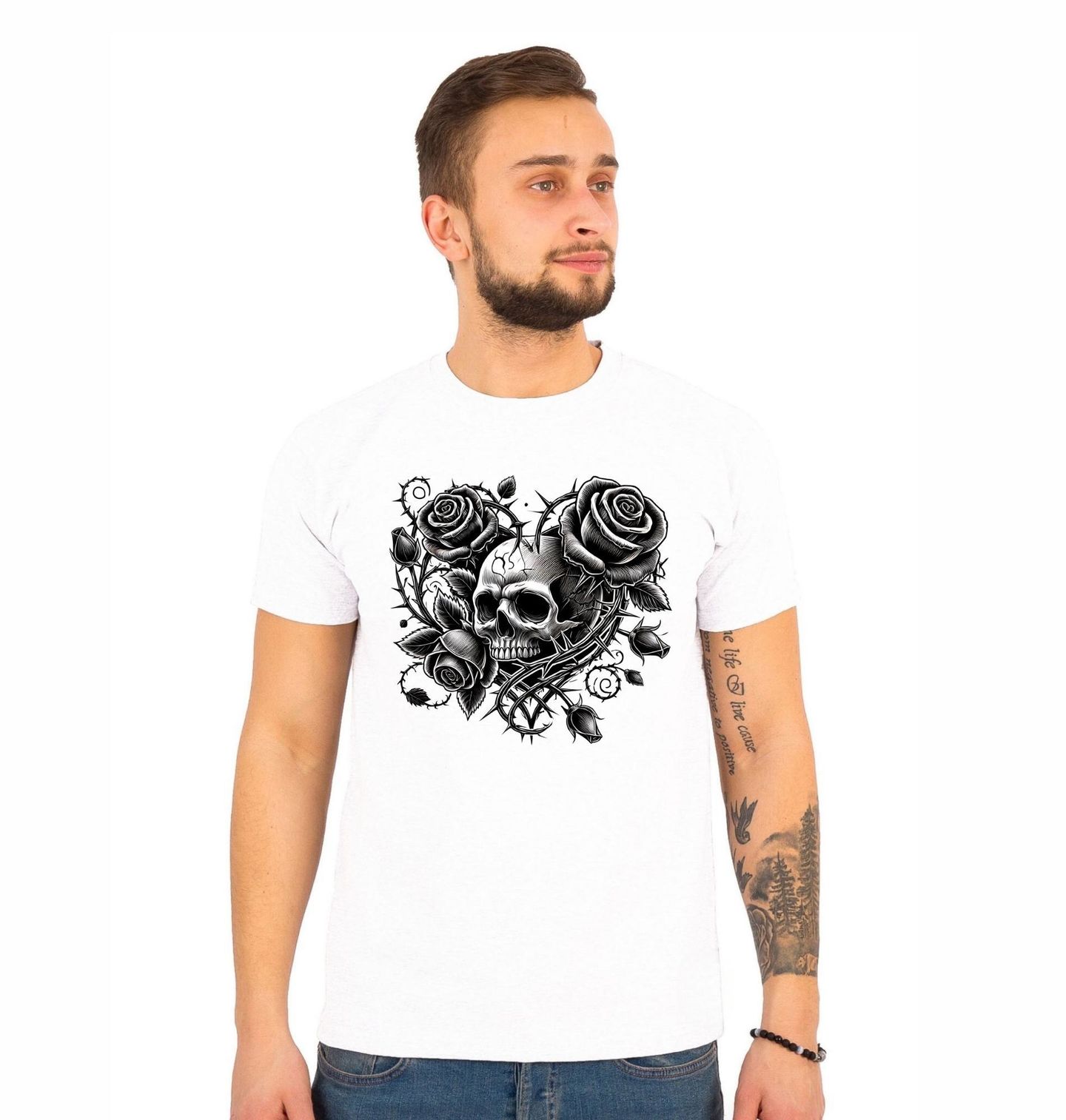 Pánské tričko Trnitá Láska Lebka a Růže. Stylové a temné tričko s uměleckým motivem, na kterém dominuje lebka obklopená realisticky vyobrazenými růžemi a ostrými trny. Tento detailní černobílý design spojuje krásu a smrt – symboliku života a jeho pomíjivosti, něžnosti i bolesti v jednom obraze.