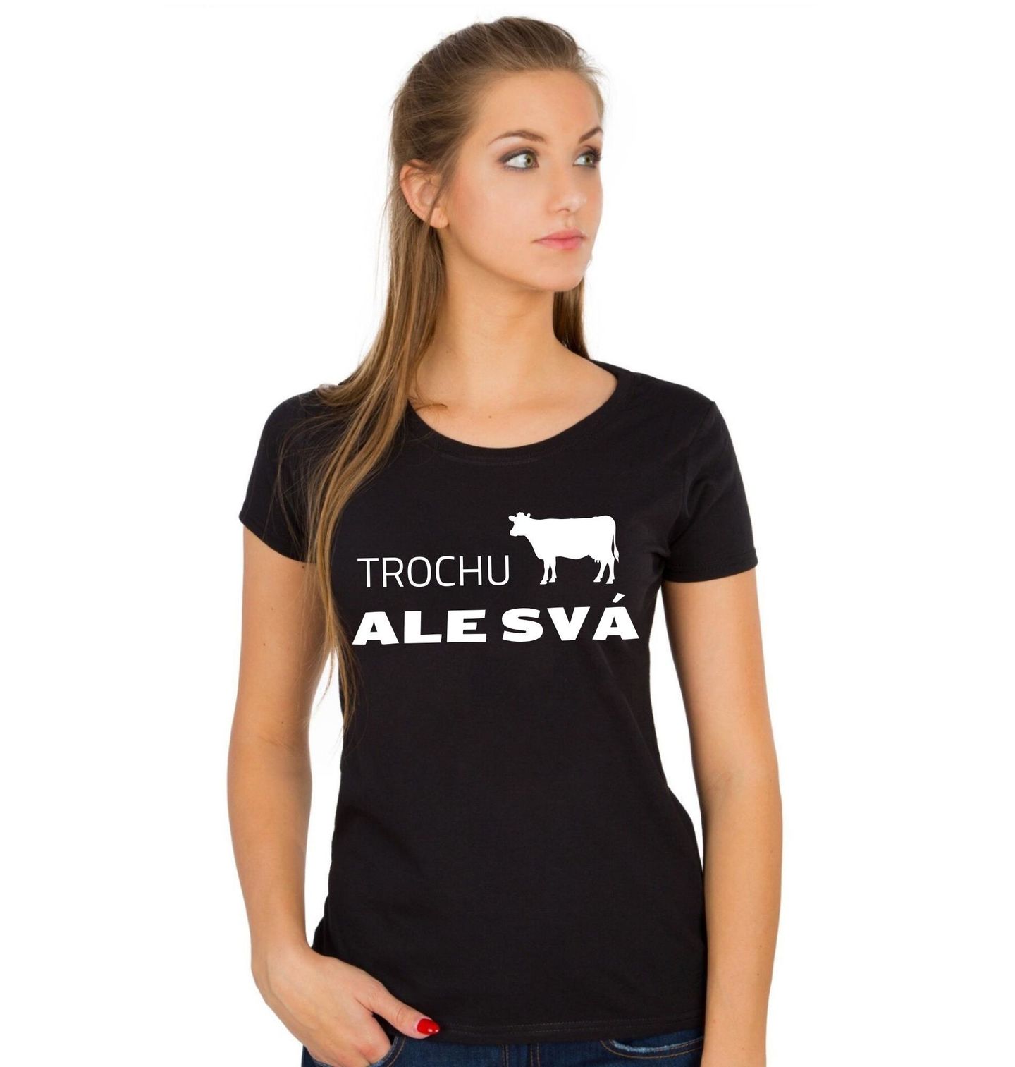 Dámské tričko Trochu Kráva ale Svá. Vtipný motiv „Trochu ale svá“ s jednoduchou siluetou krávy je ideální pro všechny, kdo milují suchý humor a jemný sarkasmus. Minimalistický design a slovní hříčka dávají jasně najevo, že sebevědomí a nadhled patří k životu stejně jako dobrá nálada. Tento motiv ocení každý, komu je blízký sarkasmus a rád si dělá legraci sám ze sebe i ze svého okolí.