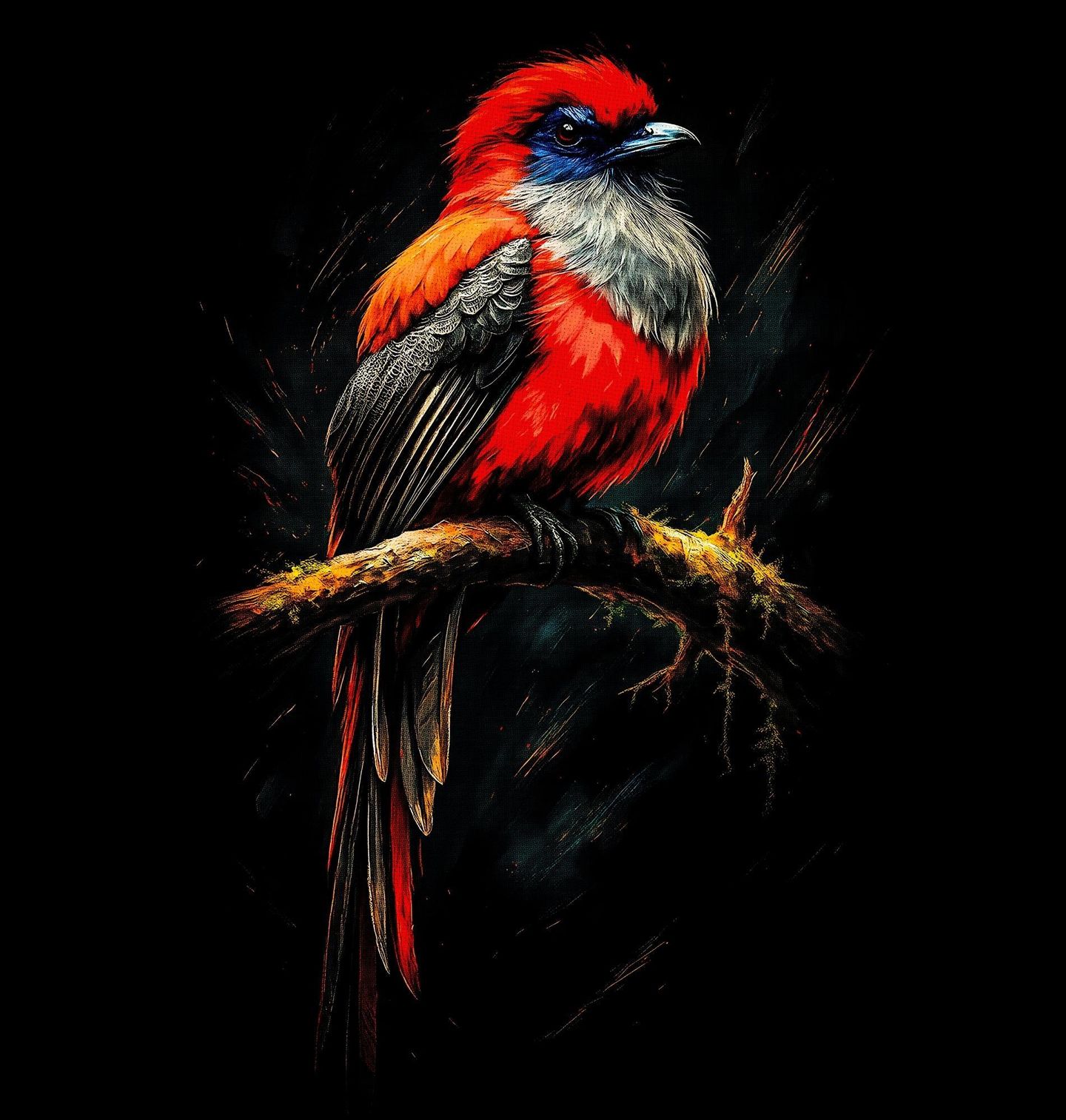 Pánské tričko Trogon šedoprsý. Výrazný motiv zachycuje exotický pták trogon šedoprsý, elegantní druh žijící v tropických lesích Střední a Jižní Ameriky. Tento pták je známý svým kontrastním zbarvením – šedá hruď, sytě červené břicho a tmavá křídla vytvářejí jedinečnou kombinaci, která vyniká na každém produktu.