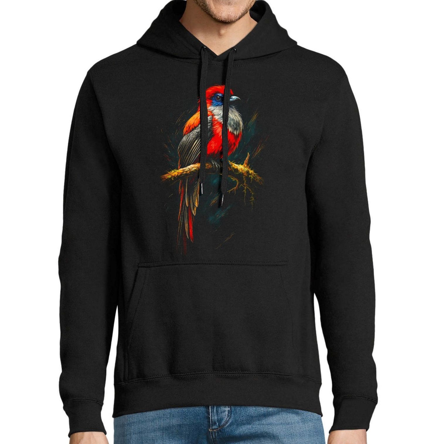 Pánská mikina Trogon šedoprsý. Výrazný motiv zachycuje exotický pták trogon šedoprsý, elegantní druh žijící v tropických lesích Střední a Jižní Ameriky. Tento pták je známý svým kontrastním zbarvením – šedá hruď, sytě červené břicho a tmavá křídla vytvářejí jedinečnou kombinaci, která vyniká na každém produktu.