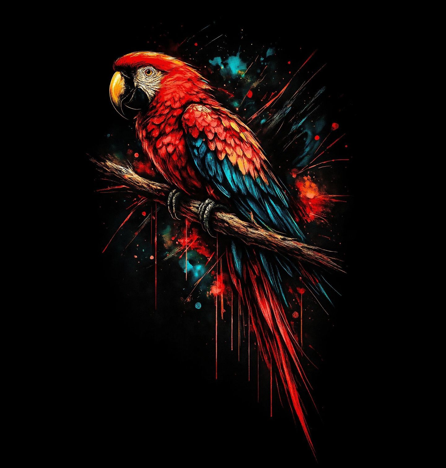 Dámské tričko Tropický Ara červený. Papoušek ara červený, ikonický tropický pták s dlouhým ocasem a sytě červeným peřím doplněným modrými a žlutými tóny. Ara červený je inteligentní papoušek, který se v přírodě vyskytuje v deštných pralesech Střední a Jižní Ameriky. Je známý svou věrností partnerovi, hlasitým projevem a silnou osobností.