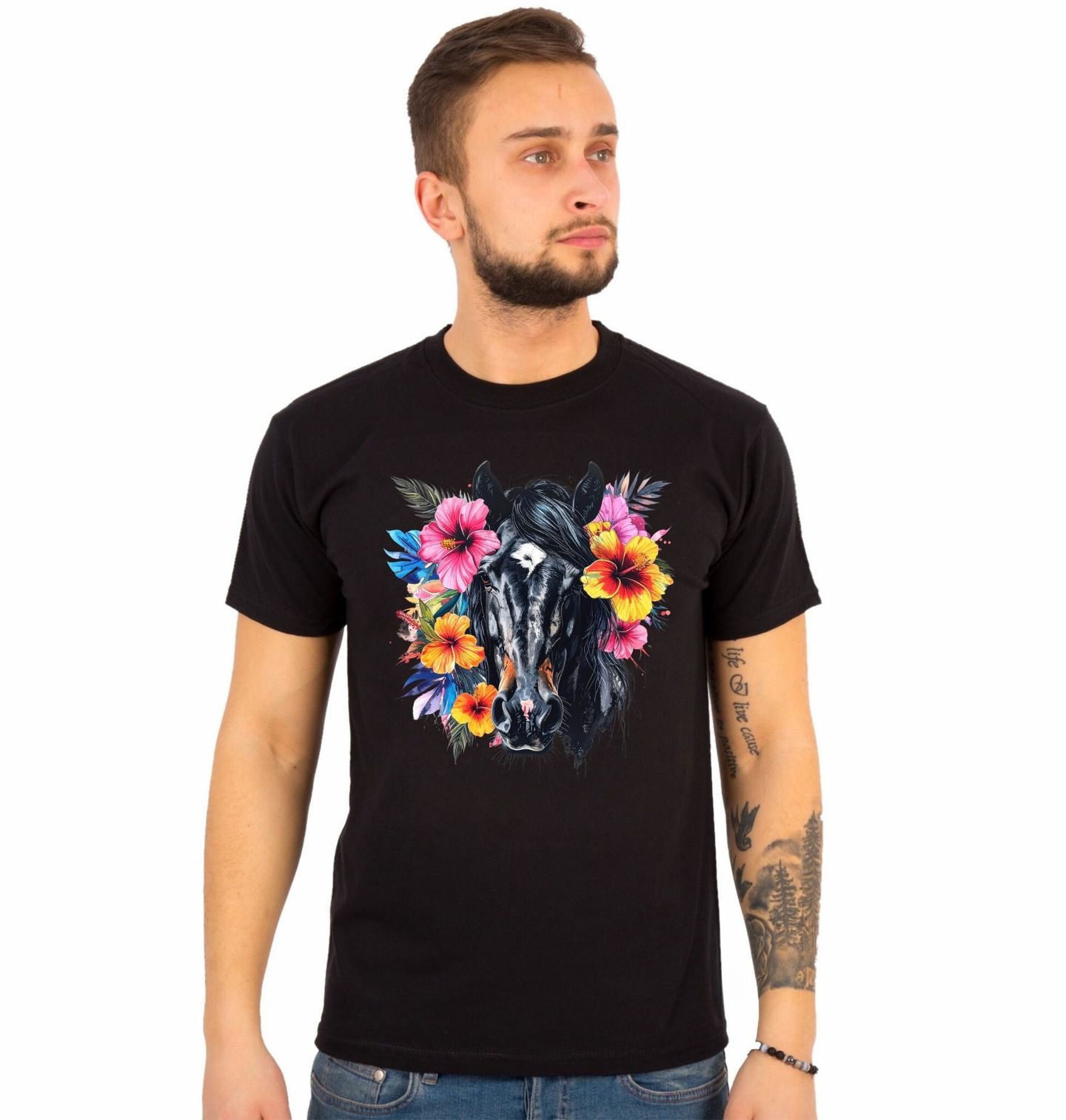 Pánské tričko Tropický Černý Kůň. Výrazný a stylový motiv, kde dominuje majestátní kůň doplněný o pestré tropické květiny v živých barvách. Design spojuje sílu zvířete s jemností přírody a vytváří moderní ilustraci, která okamžitě zaujme na první pohled. Detailní zpracování a kontrastní kombinace barev dodává motivu luxusní a umělecký vzhled.