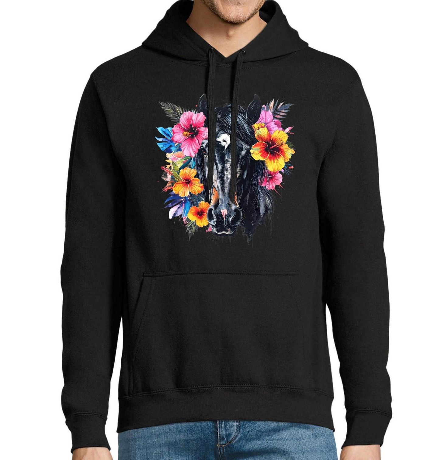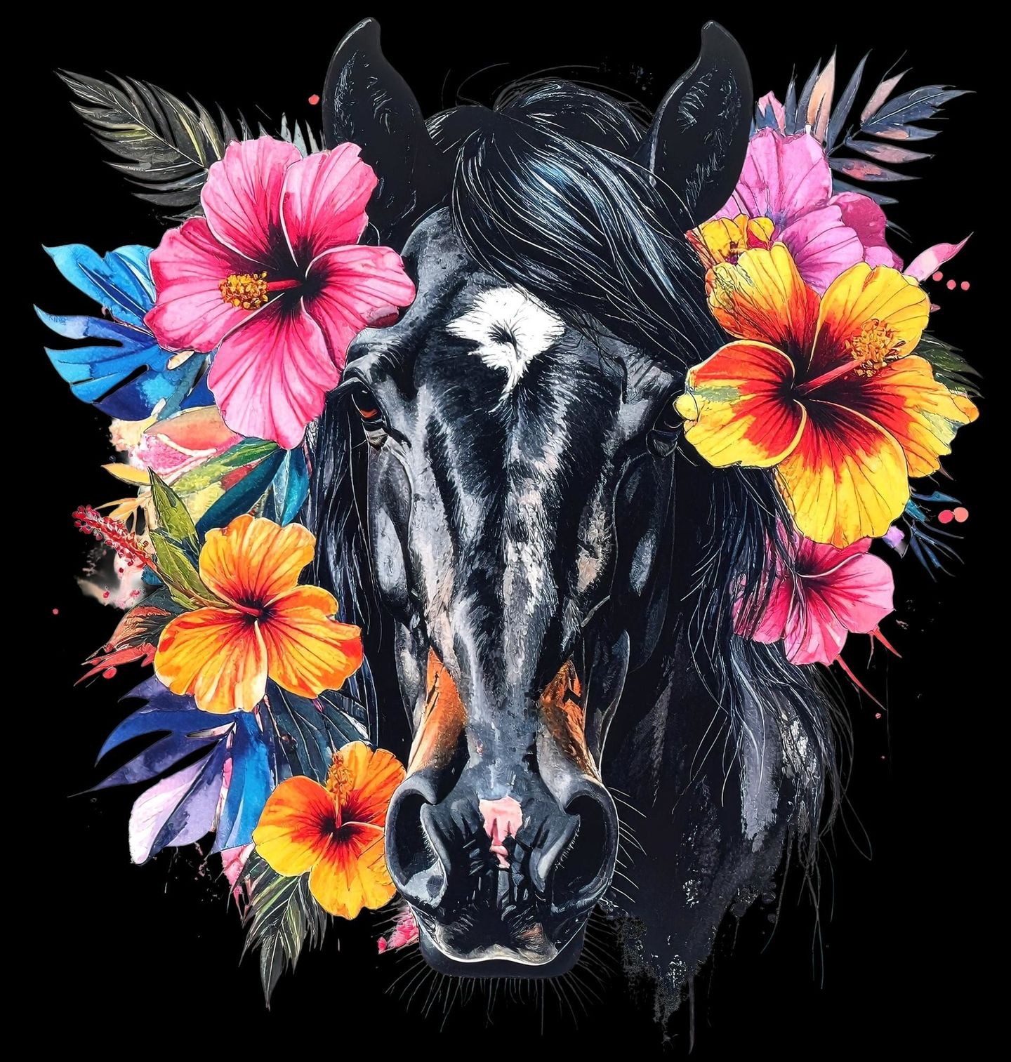 Pánská mikina Tropický Černý Kůň. Výrazný a stylový motiv, kde dominuje majestátní kůň doplněný o pestré tropické květiny v živých barvách. Design spojuje sílu zvířete s jemností přírody a vytváří moderní ilustraci, která okamžitě zaujme na první pohled. Detailní zpracování a kontrastní kombinace barev dodává motivu luxusní a umělecký vzhled.