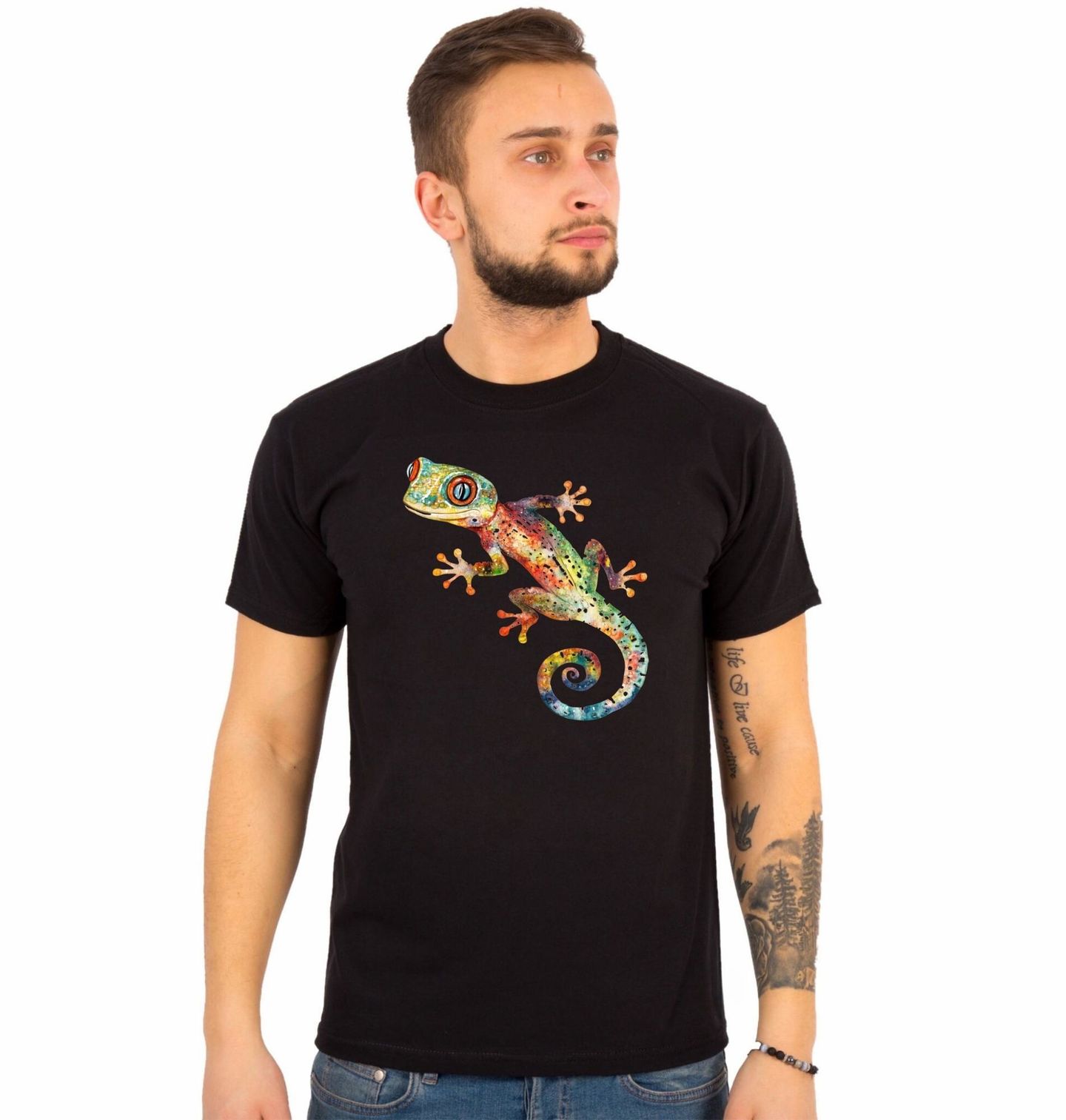 Pánské tričko Tropický Gekon. Akvarelový motiv zobrazuje gekona v pohybu, s typicky roztaženými prsty a spirálovitě stočeným ocasem. Gekon patří mezi nejoblíbenější tropické ještěrky, známé svou schopností lézt po hladkých plochách a aktivním nočním životem. Motiv je ideální pro milovníky exotických zvířat, přírody a barevných ilustrací.