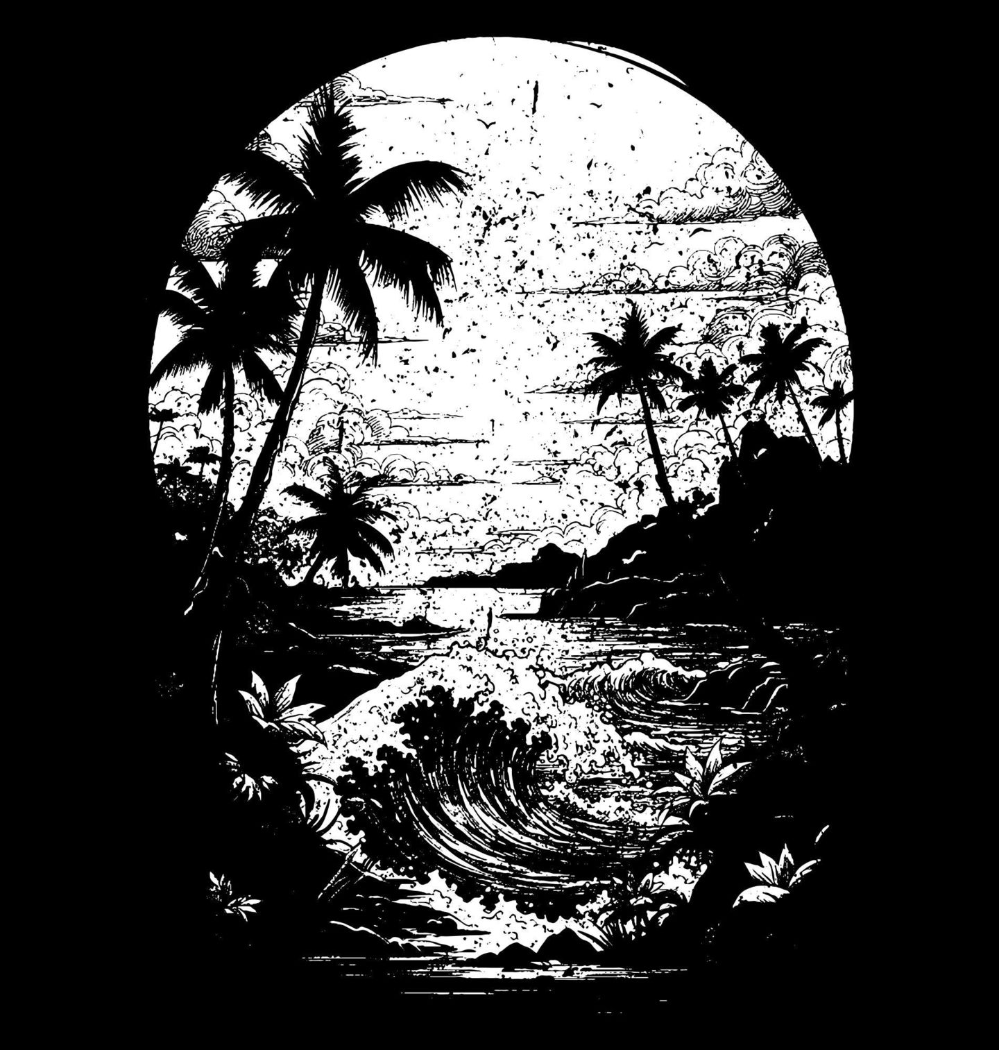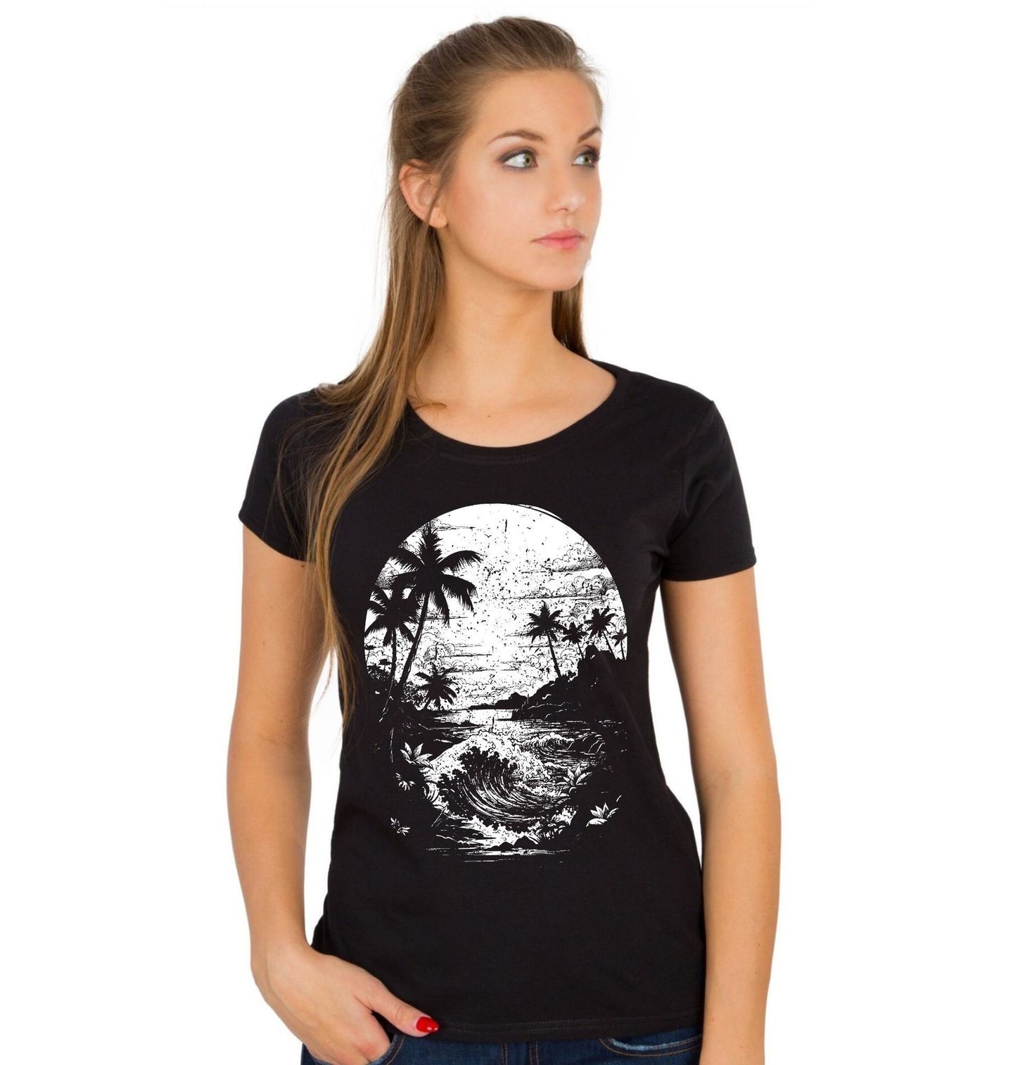 Dámské tričko Tropický Ráj. Tento stylový motiv zachycuje kouzlo tropické přírody, kde se divoké vlny setkávají s klidnou pláží a nekonečné moře se rozprostírá až k obzoru. Siluety palmy dodávají celé scéně exotickou atmosféru a přenášejí vás přímo do slunečného ráje.