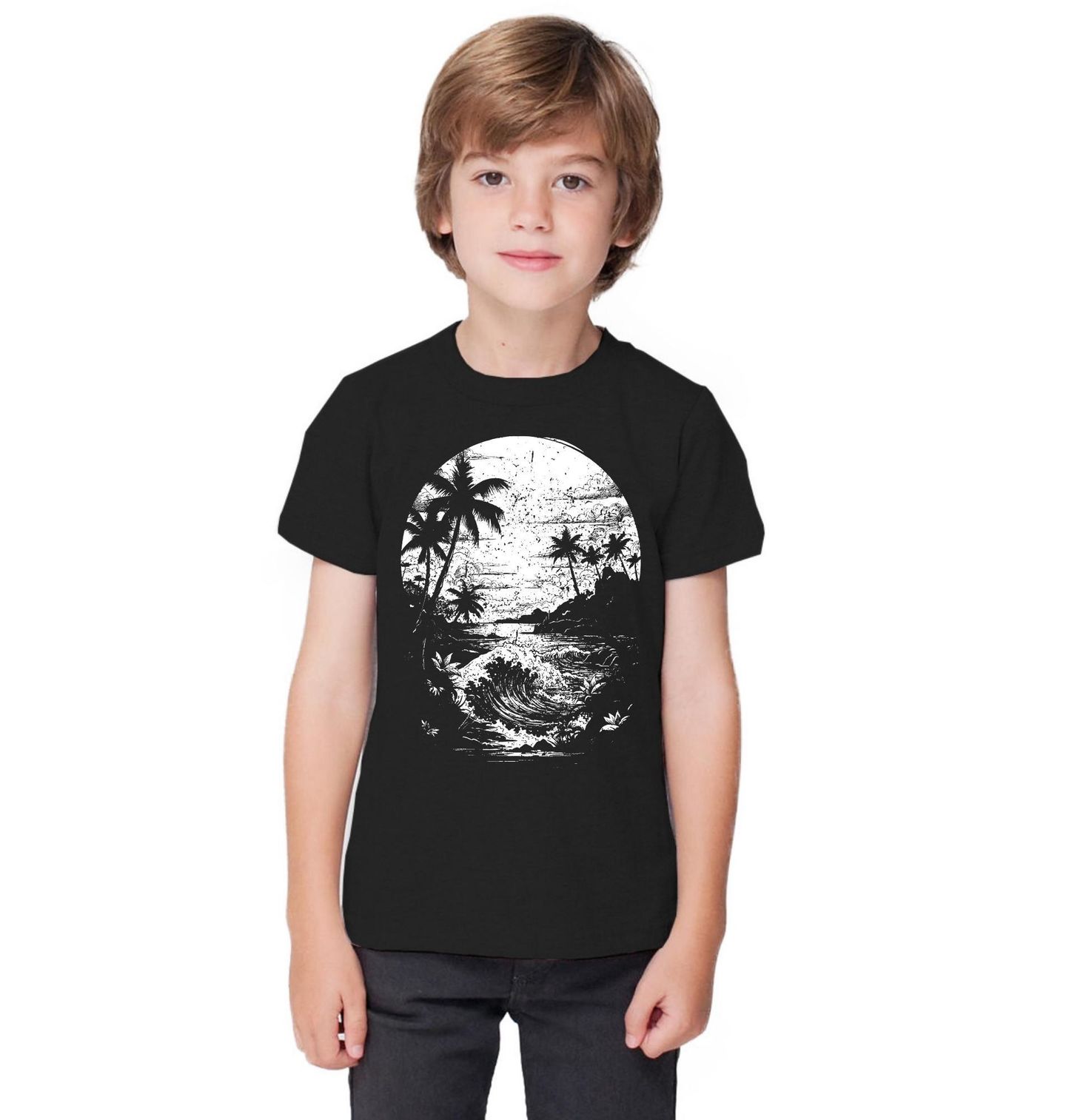 Dětské tričko Tropický Ráj. Tento stylový motiv zachycuje kouzlo tropické přírody, kde se divoké vlny setkávají s klidnou pláží a nekonečné moře se rozprostírá až k obzoru. Siluety palmy dodávají celé scéně exotickou atmosféru a přenášejí vás přímo do slunečného ráje.