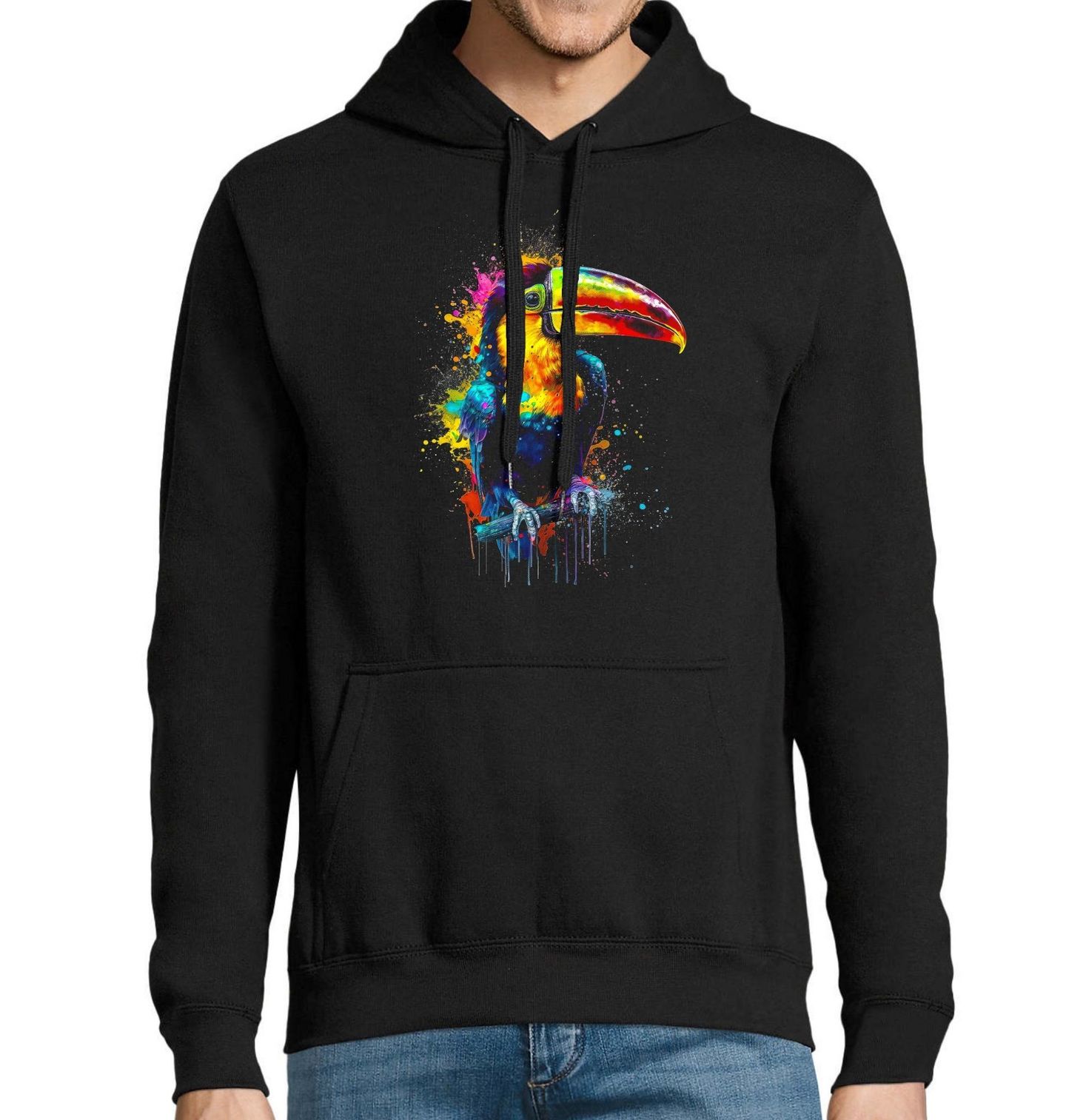 Pánská mikina Tropický Tukan obrovský. Zářivě barevný motiv exotického ptáka tukana zaujme na první pohled. Tričko je ideální pro milovníky přírody, umění i tropických zvířat. Tukan je ikonický pták pocházející z deštných pralesů Jižní Ameriky – jeho velký barevný zobák a pestré peří symbolizují svobodu, exotiku a kreativitu.