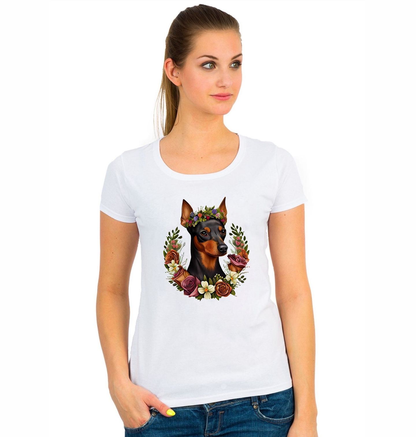 Dámské tričko Trpasličí pinč v Květinovém Věnci. Elegantní pes plemene Trpasličí pinč, obklopený bohatým věncem z barevných květin. Typický hrdý postoj, bystrý pohled a ušlechtilé rysy pinče jsou zde doplněny o krásné květiny. Motiv osloví každého pejskaře, který má blízký vztah ke svému psímu parťákovi.