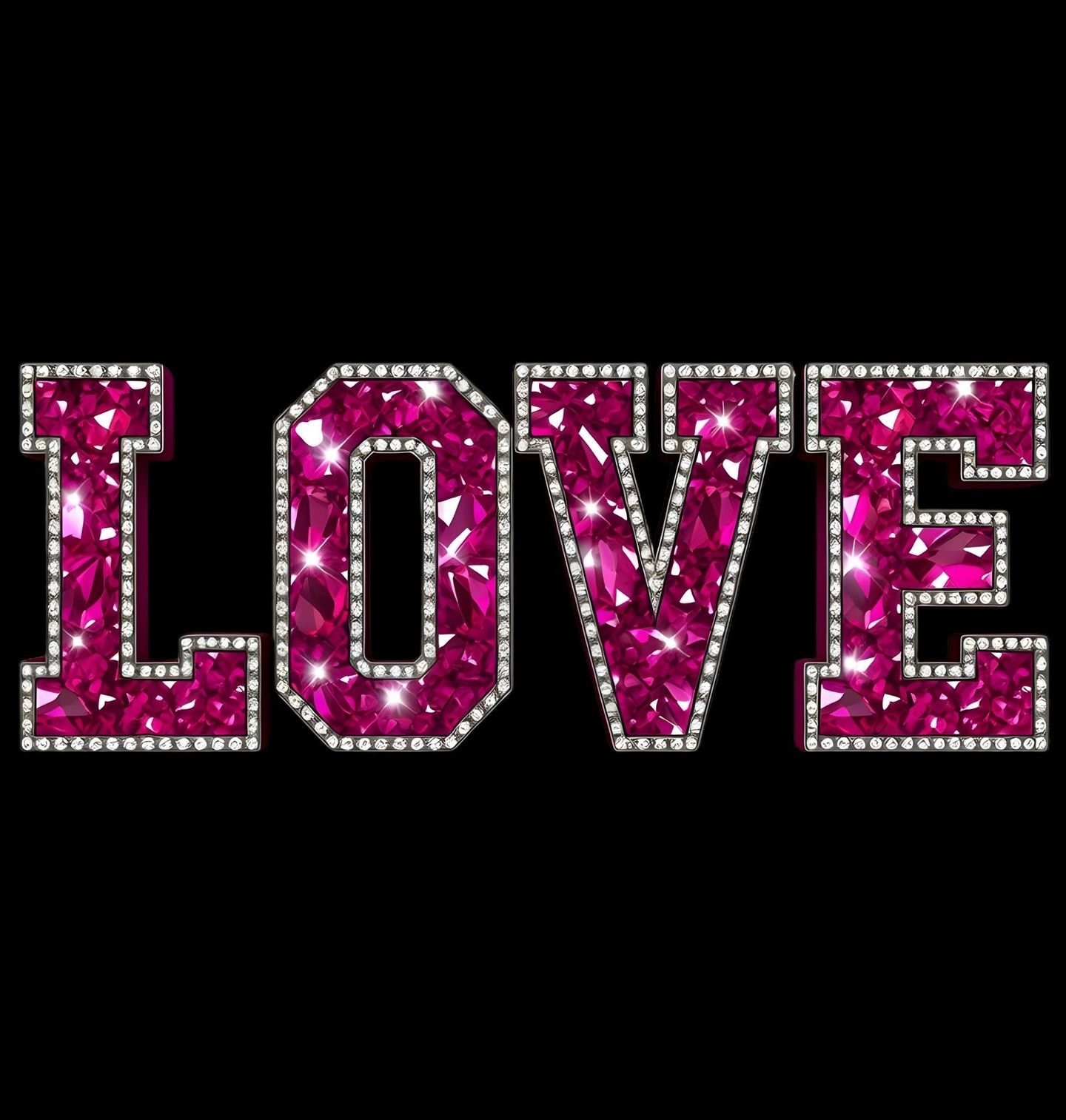 Dámské tričko Třpytivá Láska LOVE. Výrazný typografický motiv slova LOVE ztvárňuje láska v její nejzářivější podobě. Růžové drahokamové písmo s třpytivými detaily připomínajícími diamanty symbolizuje emoce, vášeň a eleganci. Tento design je oslavou citu, který nepotřebuje vysvětlení – stačí jeden pohled.