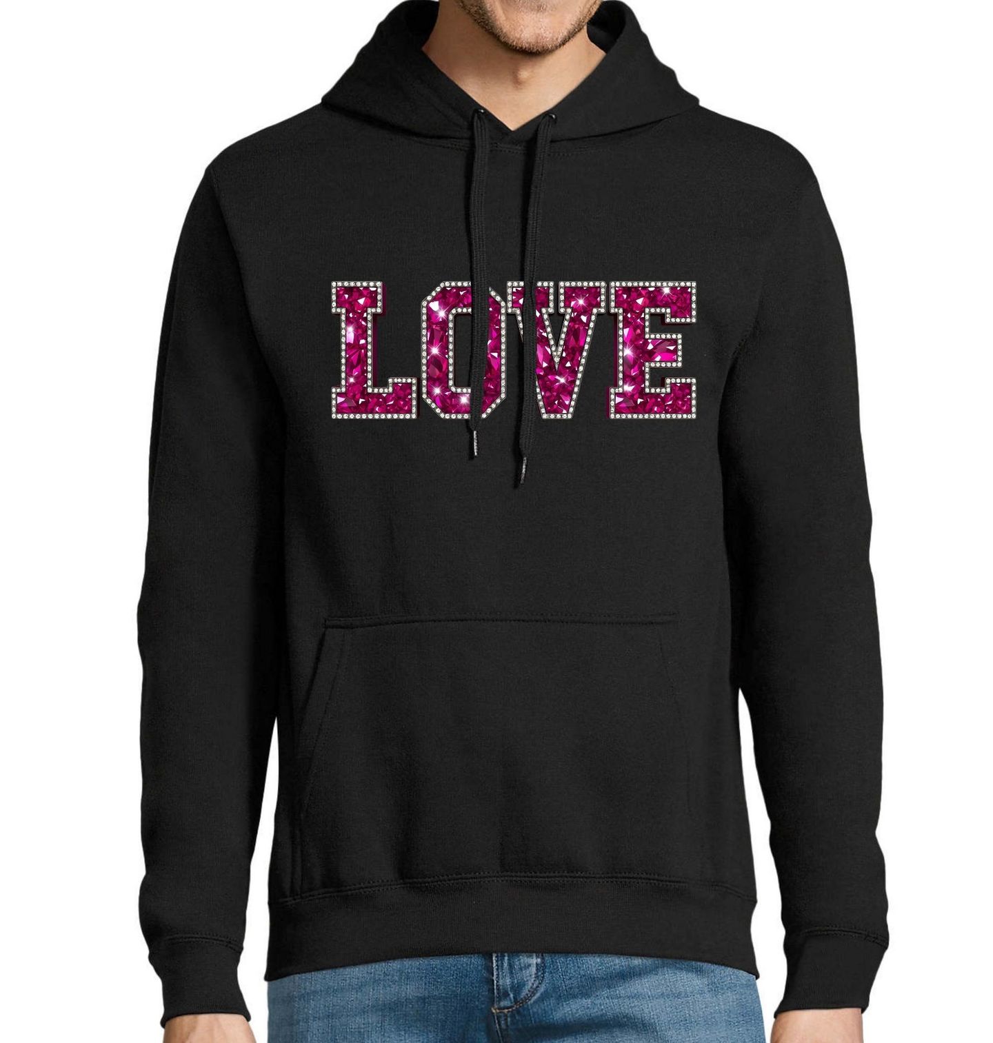 Pánská mikina Třpytivá Láska LOVE. Výrazný typografický motiv slova LOVE ztvárňuje láska v její nejzářivější podobě. Růžové drahokamové písmo s třpytivými detaily připomínajícími diamanty symbolizuje emoce, vášeň a eleganci. Tento design je oslavou citu, který nepotřebuje vysvětlení – stačí jeden pohled.